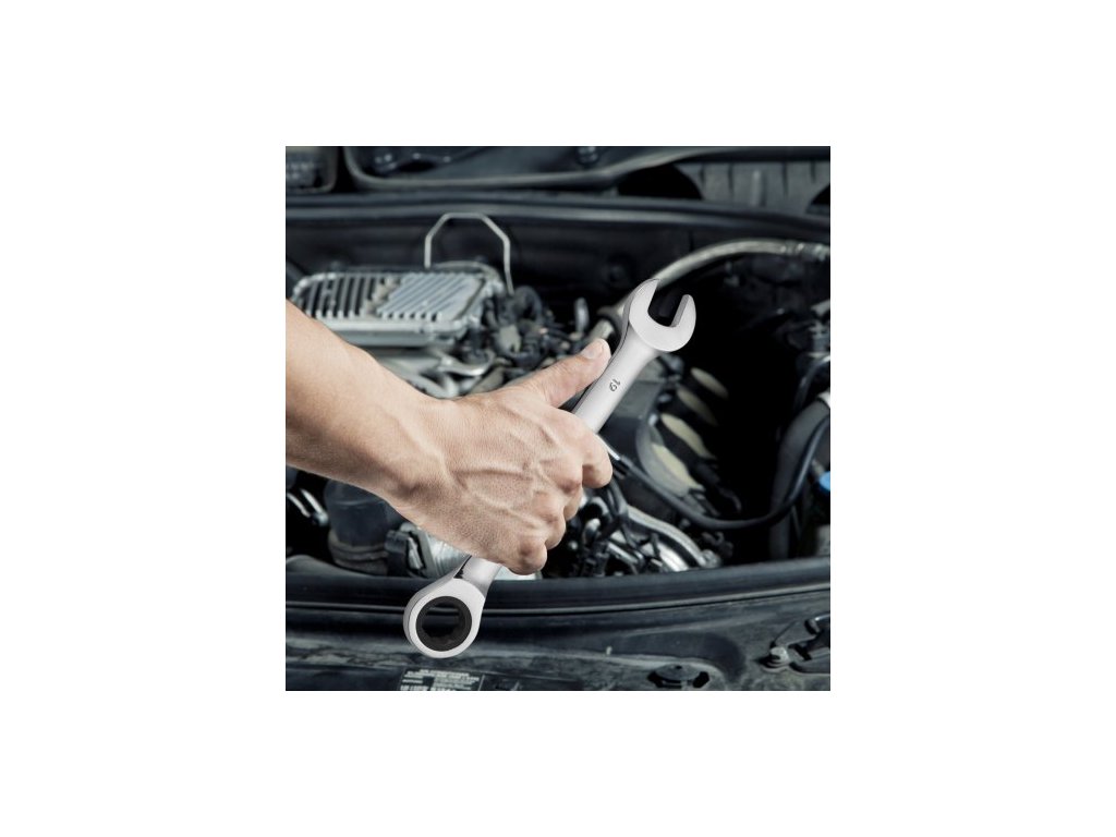 Materiál ráčny: chrom-vanadová ocel,Rozměry výrobku (D x Š x V, maximální velikost): 9,3 x 8 x 1,5 palce/235 x 205 x 38 mm,Typ výrobku: Střední velikost, pevný (metrický),Barva: stříbrná,Počet zubů: 72,Číslo modelu položky: J008H,Materiál těla klíče: uhlíková ocel,Konfigurace nástroje (metrický): 8, 10, 12, 13, 14, 15, 17, 19 mm, Tvrdost: HRC42, Čistá hmotnost: 1,13 kg, Počet nástrojů: 8 ks