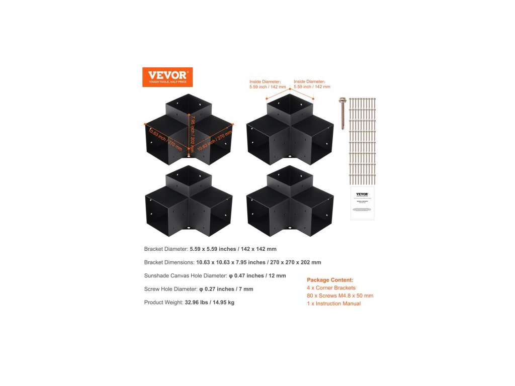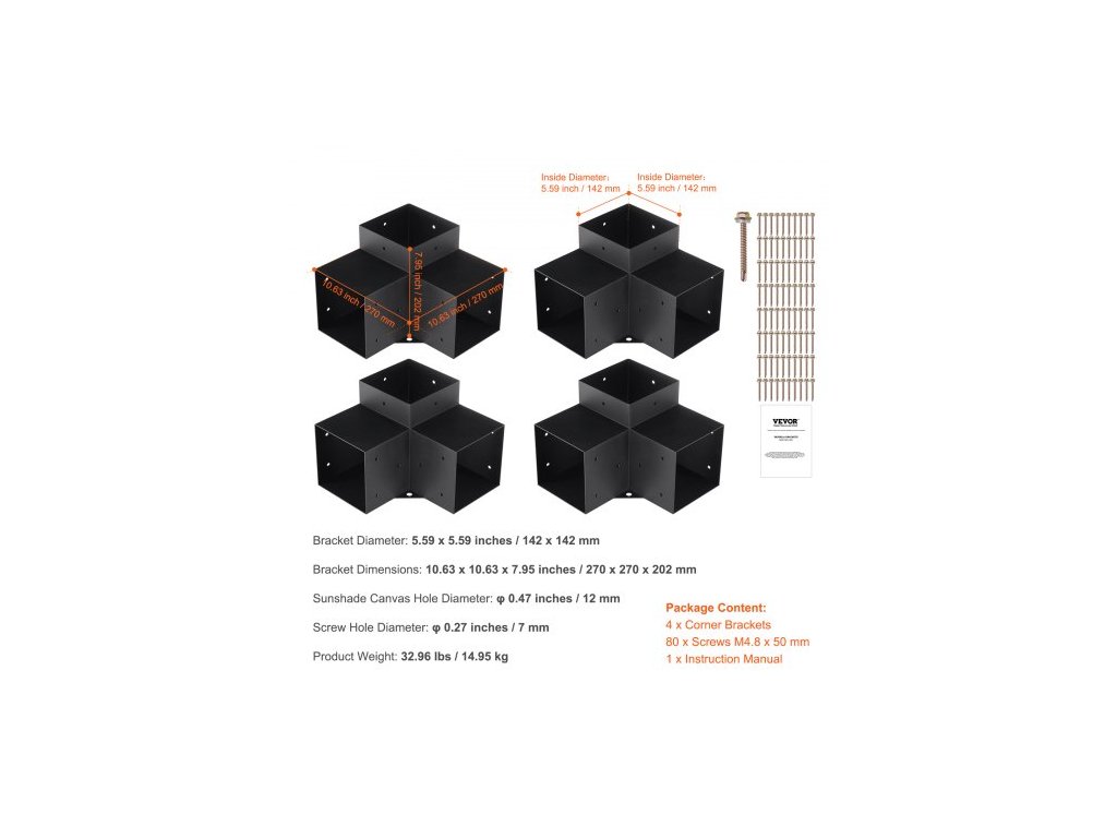 Typ konstrukce: Třícestná,Specifikace: 6" x 6",Model: SSD4,Hmotnost výrobku: 32,96 lbs / 14,95 kg, ± 3%,Množství: 4 x třícestné rohové konzole,Otvory pro zavěšení sluneční clony: Ano,Rozměry výrobku (D x Š x V): 10,63 x 10,63 x 7,95 palce / 270 x 270 x 202 mm, Hlavní materiál: Ocel