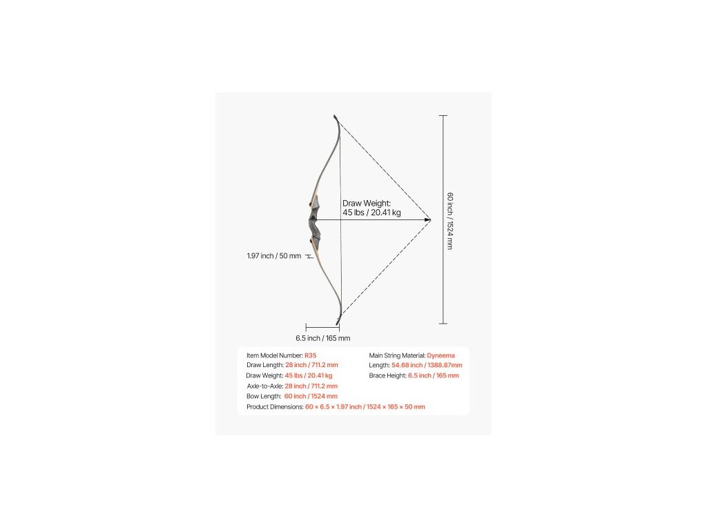 Vzdálenost mezi osami: 711,2 mm,Rozměry výrobku: 1524 x 165 x 50 mm,Číslo modelu položky: R35,Hmotnost výrobku: 2,03 kg,Délka nátahu: 711,2 mm,Délka luku: 1524 mm,Výška výztuhy: 165 mm,Síla nátahu: 45 lbs / 20,41 kg, Materiál hlavní struny: Dyneema