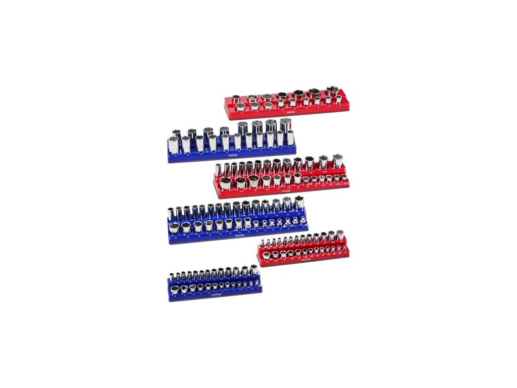 Sada magnetických organizérů na nástrčné klíče , 6dílný držák nástrčných klíčů, metrické zásobníky na nástrčné klíče SAE 1/4'', 3/8'' a 1/2'' s průhlednými štítky, pojme až 143 ks standardních a hlubokých nástrčných klíčů, modré a červené (nástrčné klíče nejsou součástí balení)Profesionální a pohodlné skladování