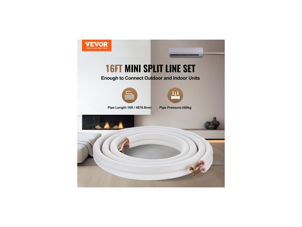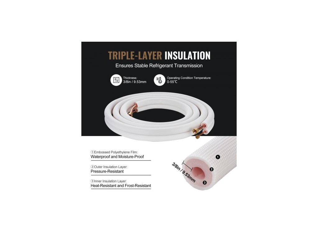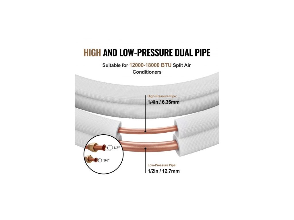 Sada mini děleného potrubí 4876,8 mm, měděné trubky s vnějším průměrem 6,4 a 12,7 mm a trojvrstvá izolace, pro klimatizaci nebo topná čerpadla a HVAC s bohatým příslušenstvím (připojovací kabel 18 stop)Vysoká flexibilita