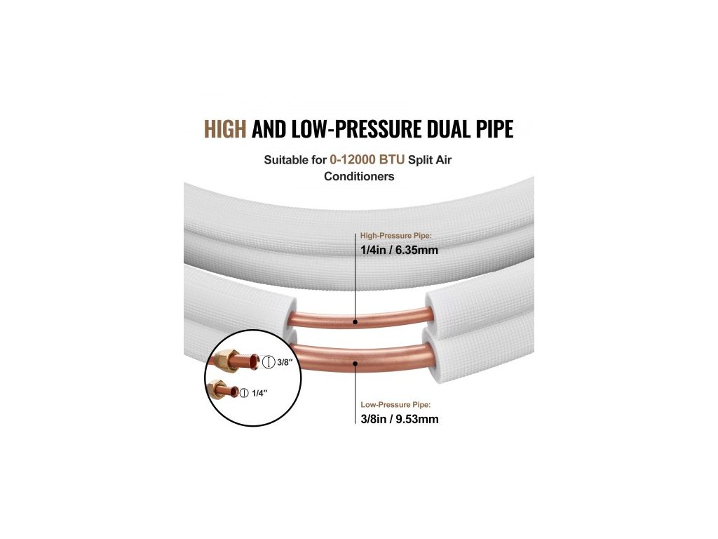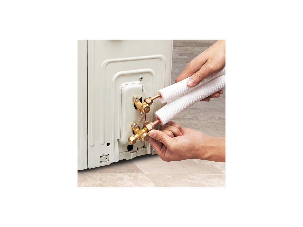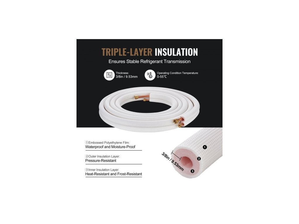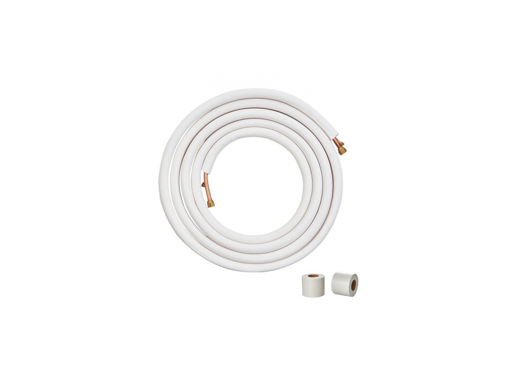 Sada mini děleného potrubí 7620 mm, měděné trubky s vnějším průměrem 6,4 a 9,5 mm a trojvrstvá izolace, pro mini dělené klimatizační systémy, chladicí nebo topná čerpadla a HVAC s ovíjecími páskami.Vysoká flexibilita