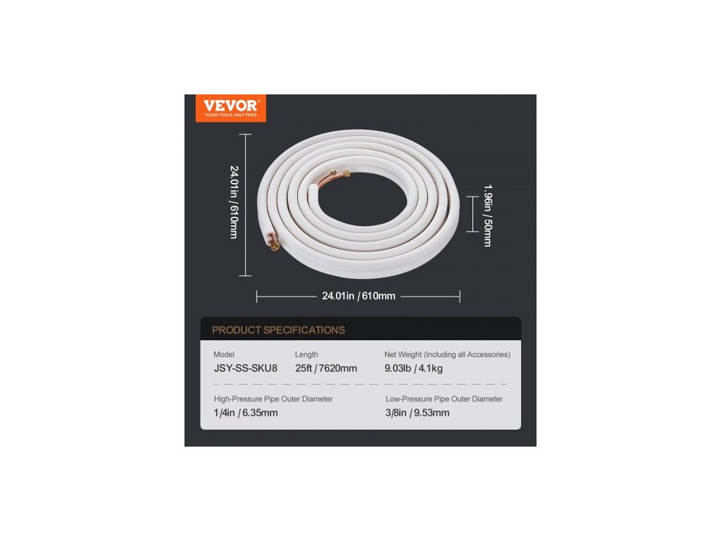 Celkové rozměry (D x Š x V): 24,01x24,01x1,96 palce / 610x610x50 mm,Délka: 25 stop / 7620 mm,Čistá hmotnost (včetně veškerého příslušenství): 9,03 lb / 4,1 kg,Model: JSY-SS-SKU8,Vnější průměr vysokotlaké trubky: 1/4 palce / 6,35 mm,Vnější průměr nízkotlaké trubky: 3/8 palce / 9,53 mm