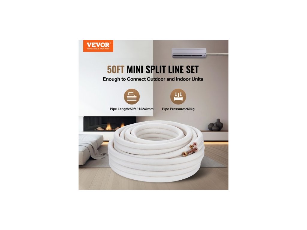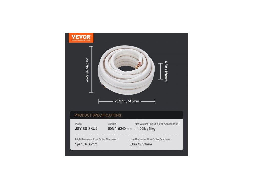 Celkové rozměry (D x Š x V): 20,27x20,27x6,3 palce / 515x515x160 mm,Délka: 50 stop / 15240 mm,Čistá hmotnost (včetně veškerého příslušenství): 11,02 lb / 5 kg,Model: JSY-SS-SKU2,Vnější průměr vysokotlaké trubky: 1/4 palce / 6,35 mm,Vnější průměr nízkotlaké trubky: 3/8 palce / 9,53 mm