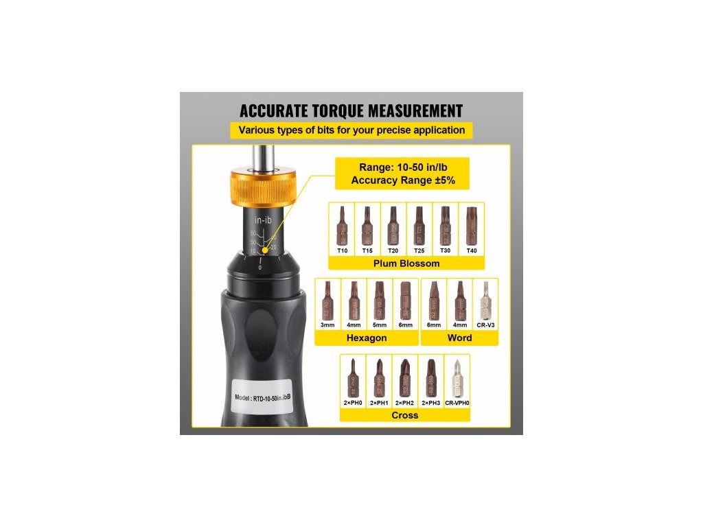 Přesnost: ±5 %,Šestihran: 3, 4, 5, 6 mm,Klíč: 4 mm, 6 mm, CR-V3,Kříž: PH0, PH1, PH2, PH3, CR-VPH0,Švestkový květ: T10, T15, T20, T25, T30, T41,krok: 5 in-lb (0,6 N-m),Model: RTD-10-50in.lbB,Materiál: Chrom-vanadová ocel + hliníková slitina + pryžový materiál, velikost pohonu: 1/4 palce, rozsah točivého momentu: 10-50 in/lb (1,1-5,6 N/m)