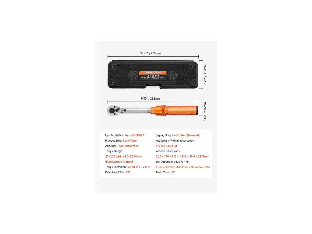 Přesnost: ±3 % (ve směru hodinových ručiček), Přírůstek momentu: 20 lbf-in / 2,2 Nm, Počet zubů: 72, Jednotky zobrazení: In-Lb / Nm (dvě jednotky), Číslo modelu položky: SG16002A, Styl produktu: Typ stupnice, Rozměry klíče: 9,25 x 1,16 x 1,16 palce / 235 x 29,5 x 29,5 mm, Čistá hmotnost (s veškerým příslušenstvím): 1,77 lb / 0,804 kg, Velikost hnací hlavy: 1/4", Rozsah točivého momentu: 20–200 lbf-in / 2,3–22,6 Nm (délka trubky: 148 mm), Rozměry krabice (D x Š x V): 10,63 x 3,29 x 2,26 palce / 270 x 83,6 x 57,3 mm