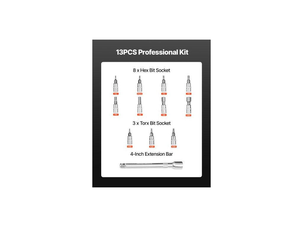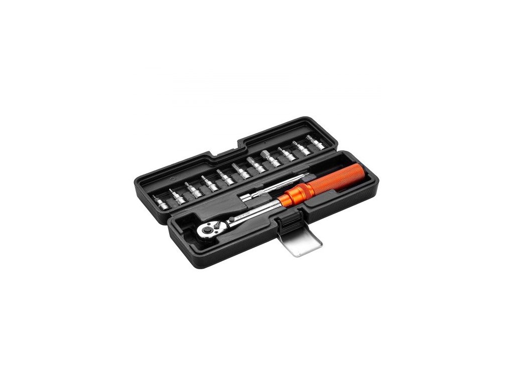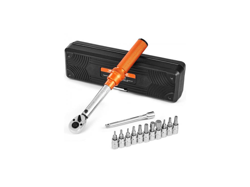 Sada momentových klíčů Click, pohon 1/4 palce, 20–200 lbf-in/2,3–22,6 Nm, stupnice s dvojitým směrem a dvojitým rozsahem, 72 zubů, vysoká přesnost ±3 %, s nástrčnými hlavicemi, prodlužovací tyčí, pro opravy jízdních kol, oranžová