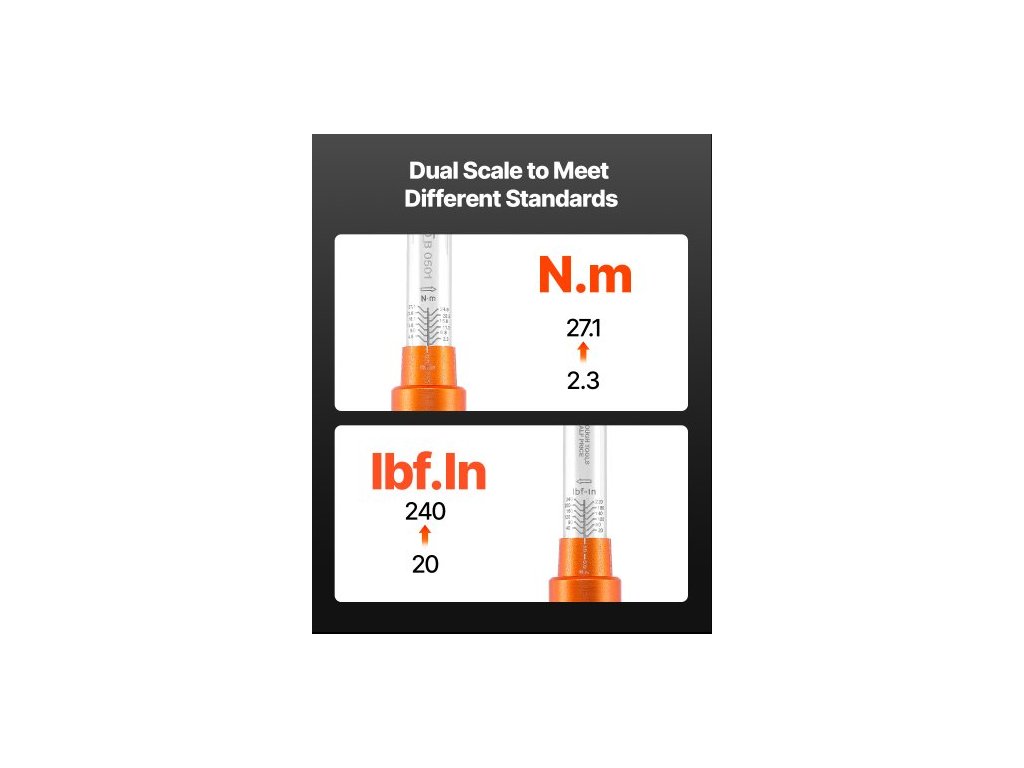 Přesnost: ±3 % (ve směru hodinových ručiček), Přírůstek momentu: 20 lbf-in / 2,2 N.m, Počet zubů: 72, Jednotky zobrazení: lbf-in / N.m (dvě jednotky), Číslo modelu položky: HG-14050, Styl produktu: Typ se stupnicí, Rozměry klíče: 9,45 x 1,16 x 1,16 palce / 240 x 29,5 x 29,5 mm, Čistá hmotnost (s veškerým příslušenstvím): 3,40 lb / 1,543 kg, Velikost hnací hlavy: 1/4", Rozsah točivého momentu: 20–240 lbf-in / 2,3–27,1 Nm (délka trubky: 148 mm), Rozměry krabice (D x Š x V): 10,63 x 7,09 x 2,17 palce / 270 x 180 x 55 mm