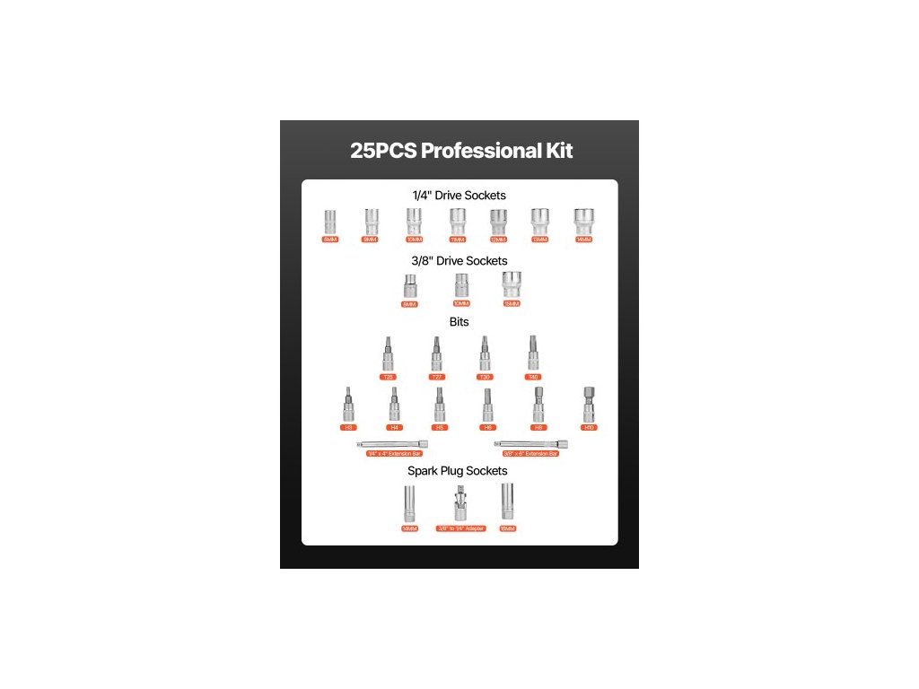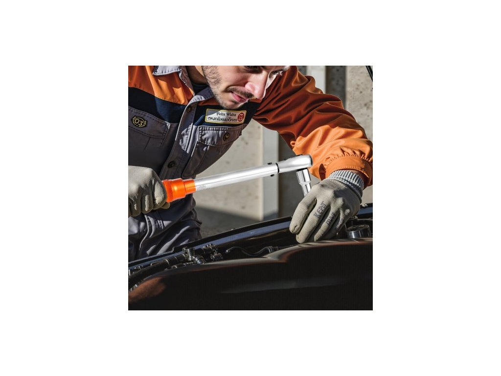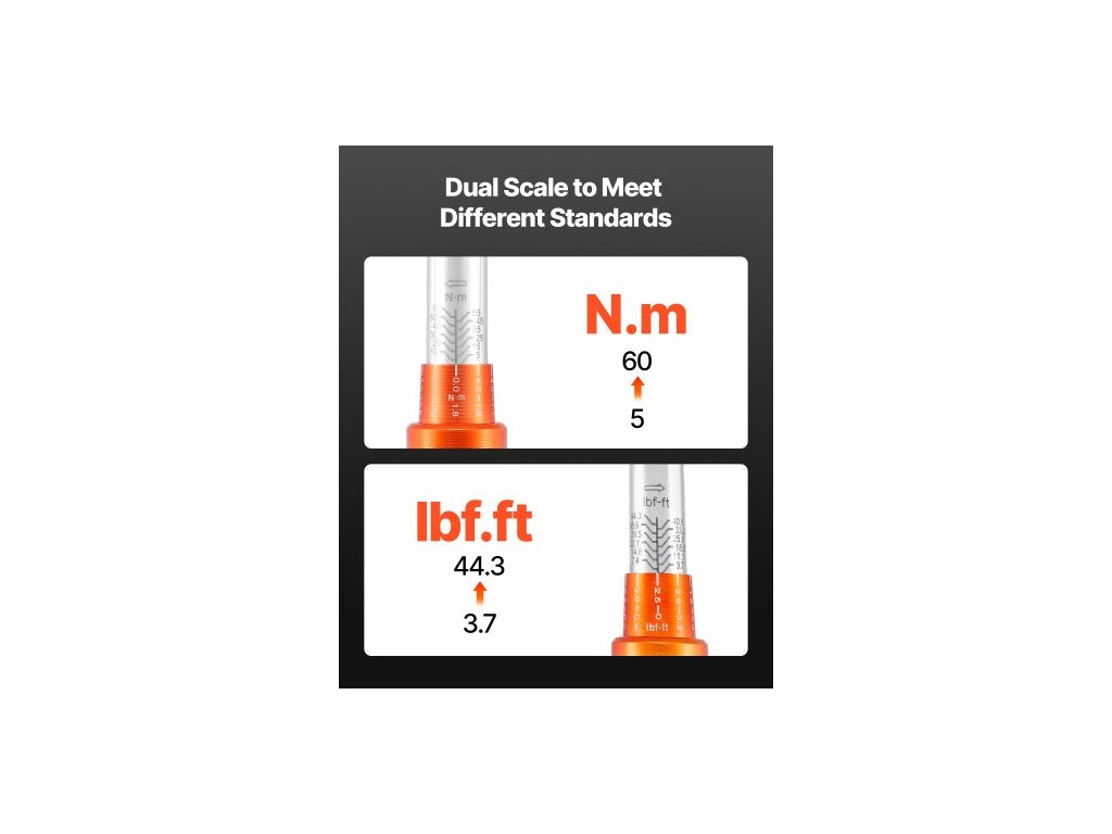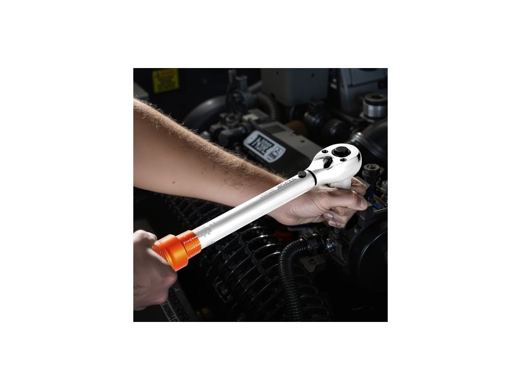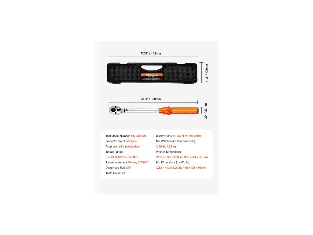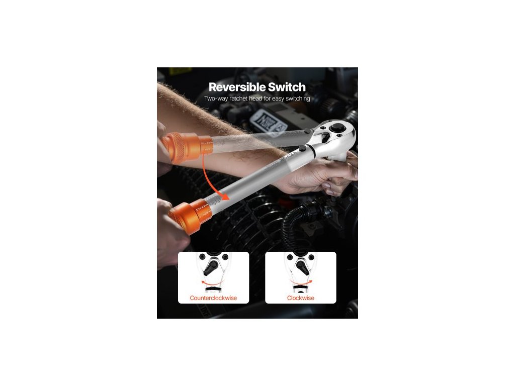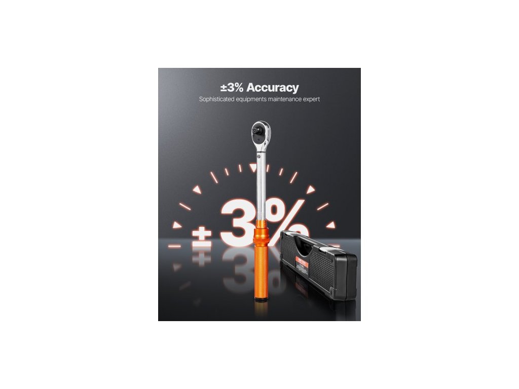 Sada momentových klíčů Click, pohon 3/8 palce, 5–60 N.m / 3,7–44,3 lbf.ft, obousměrný chod, 72 zubů, vysoká přesnost ±3 %, s nástrčnými klíči, bity, prodlužovací tyčí, nástrčnými klíči na zapalovací svíčky, adaptérem, oranžová±3 % vysoká přesnost