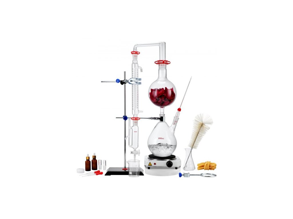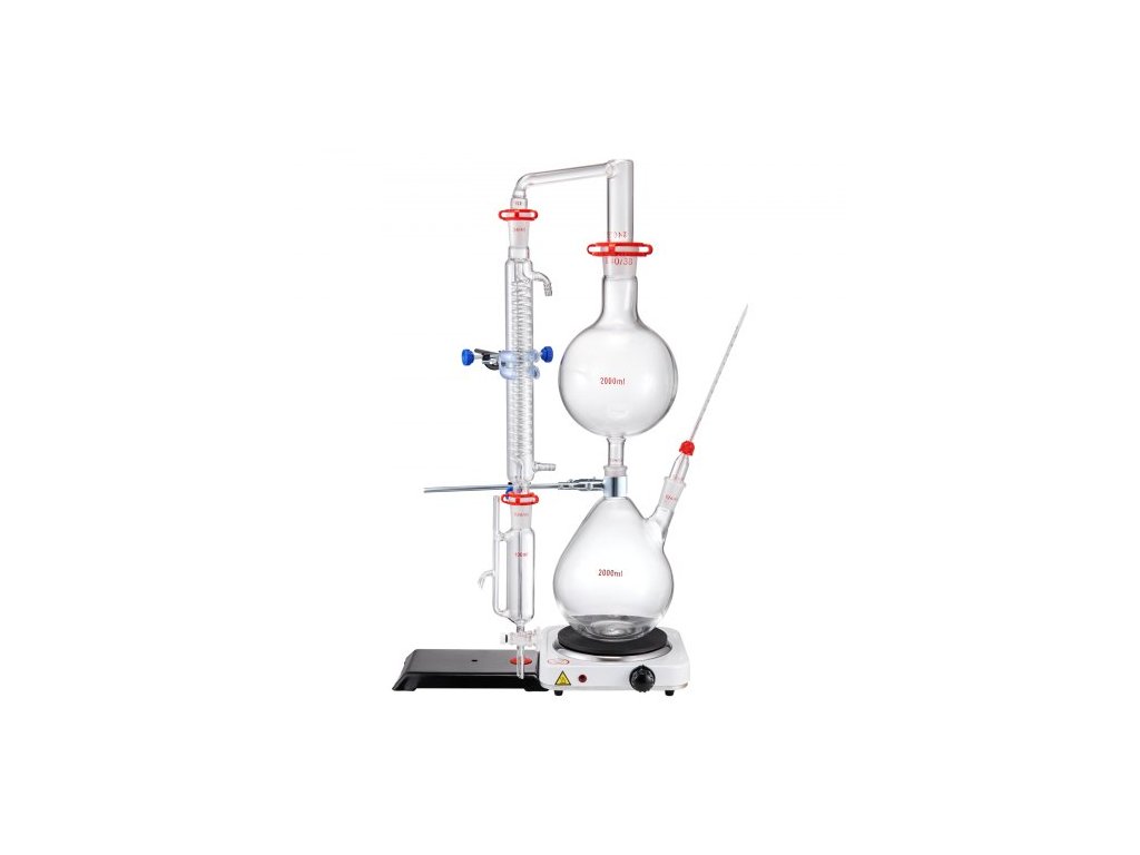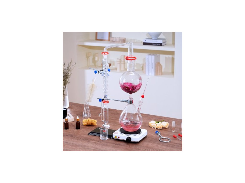 Sada na destilaci esenciálních olejů , destilační aparatura 2000 ml, destilační sada Boro Lab Glassware 3.3 s topnou deskou 1000 W a 24, 40 spoji, 28dílná sada