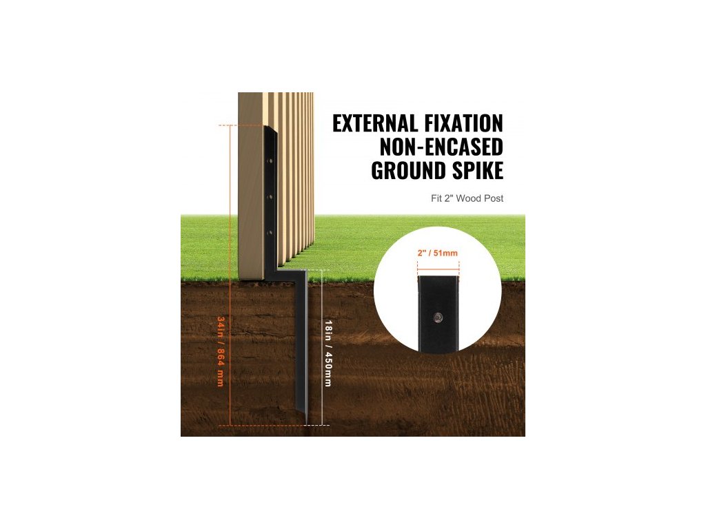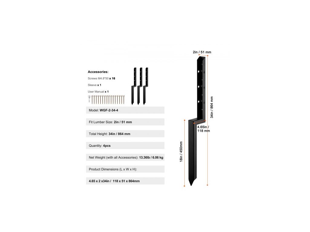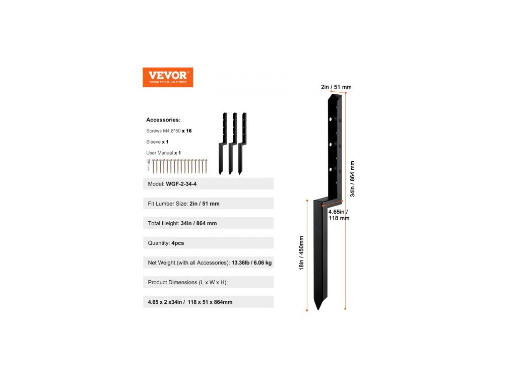 Model: WGF-2-34-4,Vhodná velikost řeziva: 2 palce / 51 mm,Množství: 4 ks,Rozměry výrobku (D x Š x V): 4,65 x 2 x 33,78 palce / 118 x 51 x 858 mm,Čistá hmotnost (s příslušenstvím): 13,36 lb / 6,06 kg,Délka hřebíků: 18 palců / 450 mm ±10 mm,Tloušťka materiálu: Hřebíková deska: 2,2 mm, Upevňovací deska sloupku: 2,2 mm, ±0,2,Hlavní materiál: Ocel, Celková výška: 864 mm