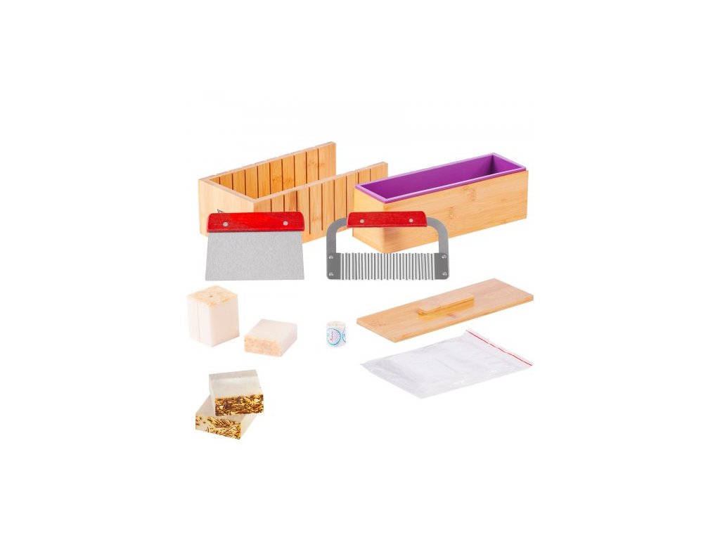 Sada na výrobu mýdla , bambusová krabička na vykrajování a vnitřní krabička se silikonovou formou, rovný a vlnitý řezací nůž z nerezové oceli, 100 sáčků a 105 samolepek, potřeby na výrobu mýdla pro kutily pro dospělé