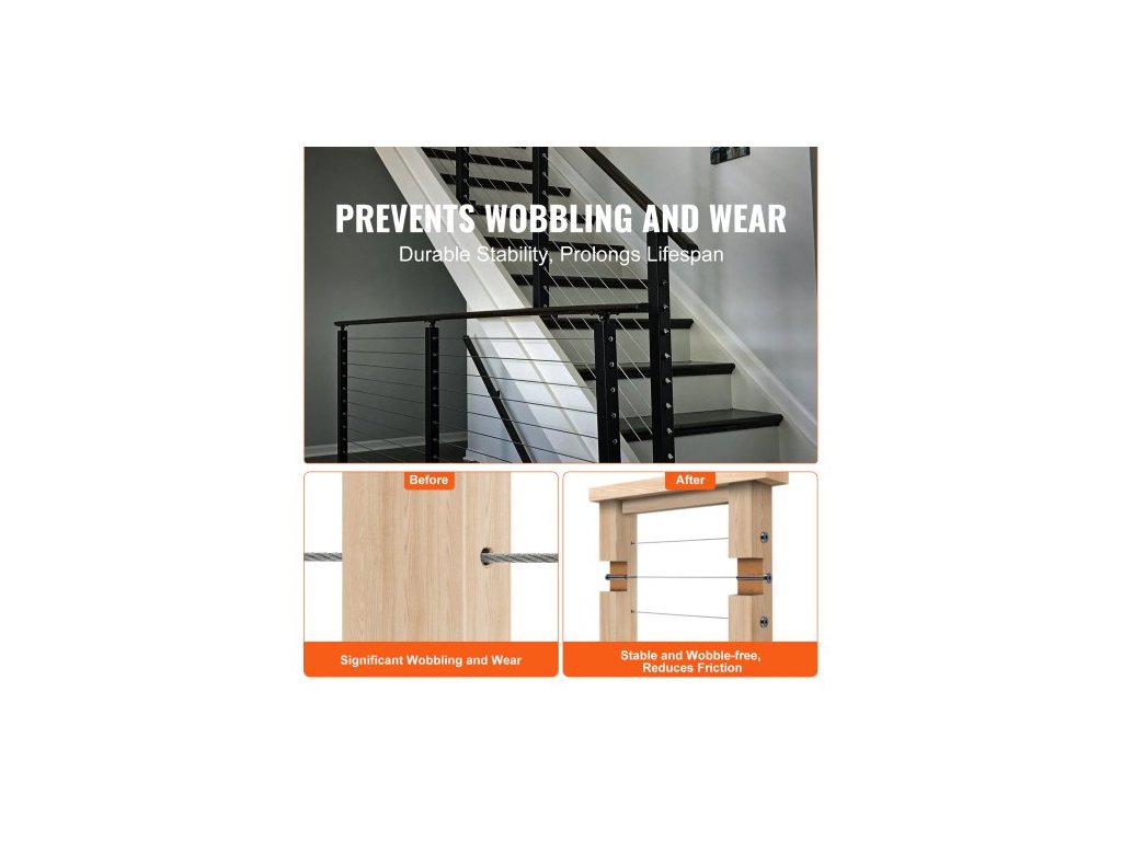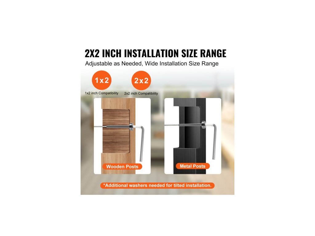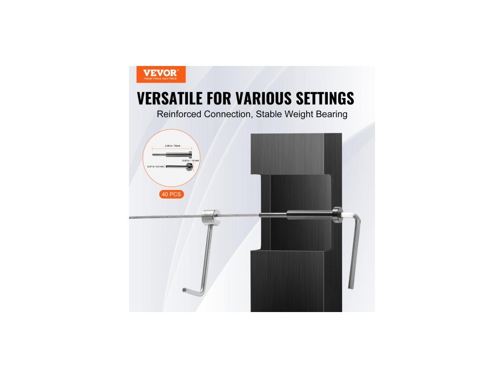 Vhodné pro: dřevěné/kovové sloupky 2x2 palce (horizontální/úhlová instalace; úhlová instalace vyžaduje úhlové podložky).,Model: YXHF-2014+2018-1/8"-40,Vhodné pro ocelová lana: 1/8 palce,Množství: 40 kusů,Rozměry: ∅0,62 x ∅0,37 x 2,99 palce / ∅16 x ∅9,5 x 76 mm,Hlavní materiál: nerezová ocel T316 Ocel, Čistá hmotnost (včetně veškerého příslušenství): 4,36 libry / 1,98 kg