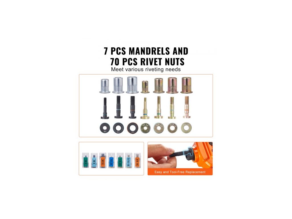 Sada nýtovacích matic , 35,6 cm sada nýtovacích nástrojů se 7 díly metrických a SAE trnů, 70 dílů různých nýtových matic, 10-24, 1/4-20, M6, 5/16-18, M8, 3/8-16, M10, sada nýtových matic s robustním přepravním pouzdrem