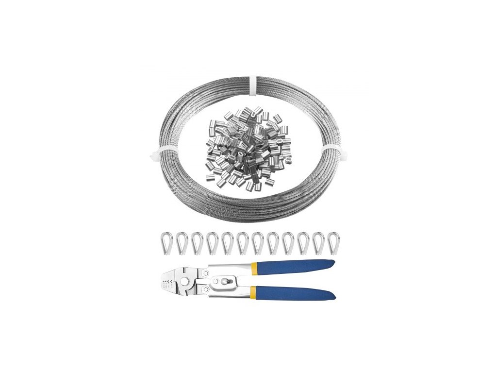 Sada ocelových lan , 1/16" 66 ft lano z nerezové oceli 304 s krimpovacími kleštěmi, 160 návleky a 12 očnicemi, 7x7 pramenů, stavební, námořní, letecká kvalita pro zábradlí, schodiště, terasu, plot, venkovní použití