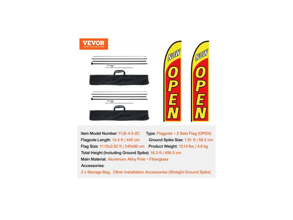 Typ: 2 sady stožárů + vlajky (OTEVŘENÉ), Délka stožáru: 14,4 ft/440 cm, Velikost hrotu do země: 1,91 ft/58,5 cm, Číslo modelu položky: FLB-4.5-2C, Hmotnost výrobku: 10,14 lbs/4,6 kg, Velikost vlajky: 11,15x2,62 ft/340x80 cm, Celková výška (včetně hrotu do země): 16,3 498,5 cm, hlavní materiál: tyč z hliníkové slitiny + sklolaminát