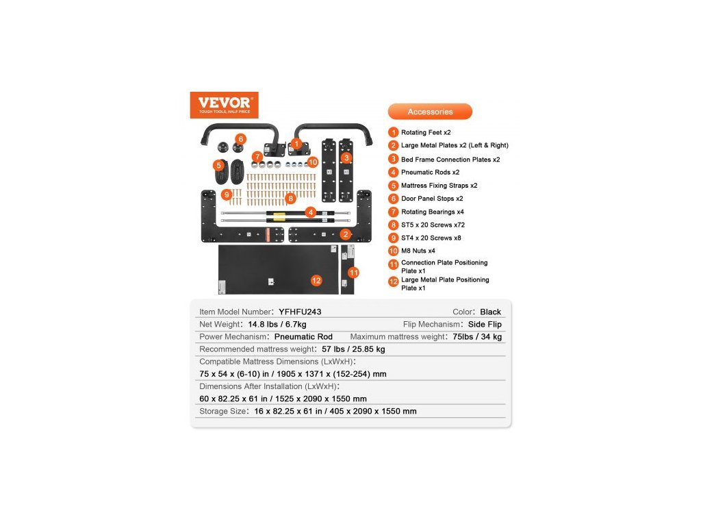 Rozměry úložného prostoru: 16x82,25x61 palců / 405x2090x1550 mm,Rozměry po instalaci (DxŠxV): 60x82,25x61 palců / 1525x2090x1550 mm,Číslo modelu položky: YFHFU243,Maximální nosnost matrace: 57 liber / 25,85 kg,Rozměry kompatibilní matrace (DxŠxV): 75x54x(6-10) palců / 1905 x 1371 x (152–254) mm, Čistá hmotnost: 14,8 lbs / 6,7 kg