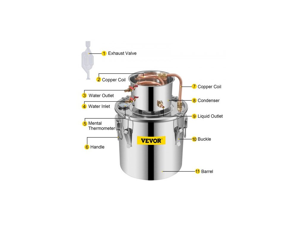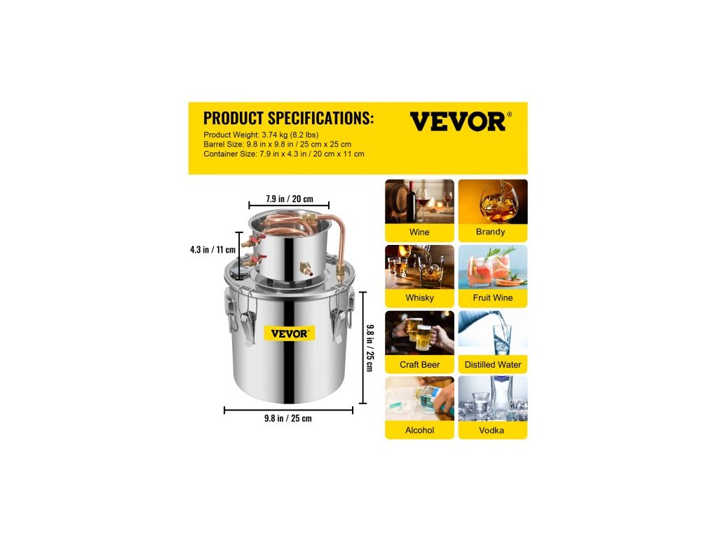 Objem kotlového sudu: 3 galony / 11,4 l,Průměr měděné cívky: 0,39" / 10 mm,Rozměry kotlového sudu: 9,8" x 9,8" / 25 x 25 cm,Rozměry kondenzačního sudu: 7,9" x 4,3" / 20 x 11 cm,Tloušťka sudu: 0,03" / 0,03" / 3,5 l,Materiál: nerezová ocel + červená měď,Objem kondenzačního sudu: 0,92 galonu / 3,5 l,Hmotnost: 8,2 lbs / 3,74 kg