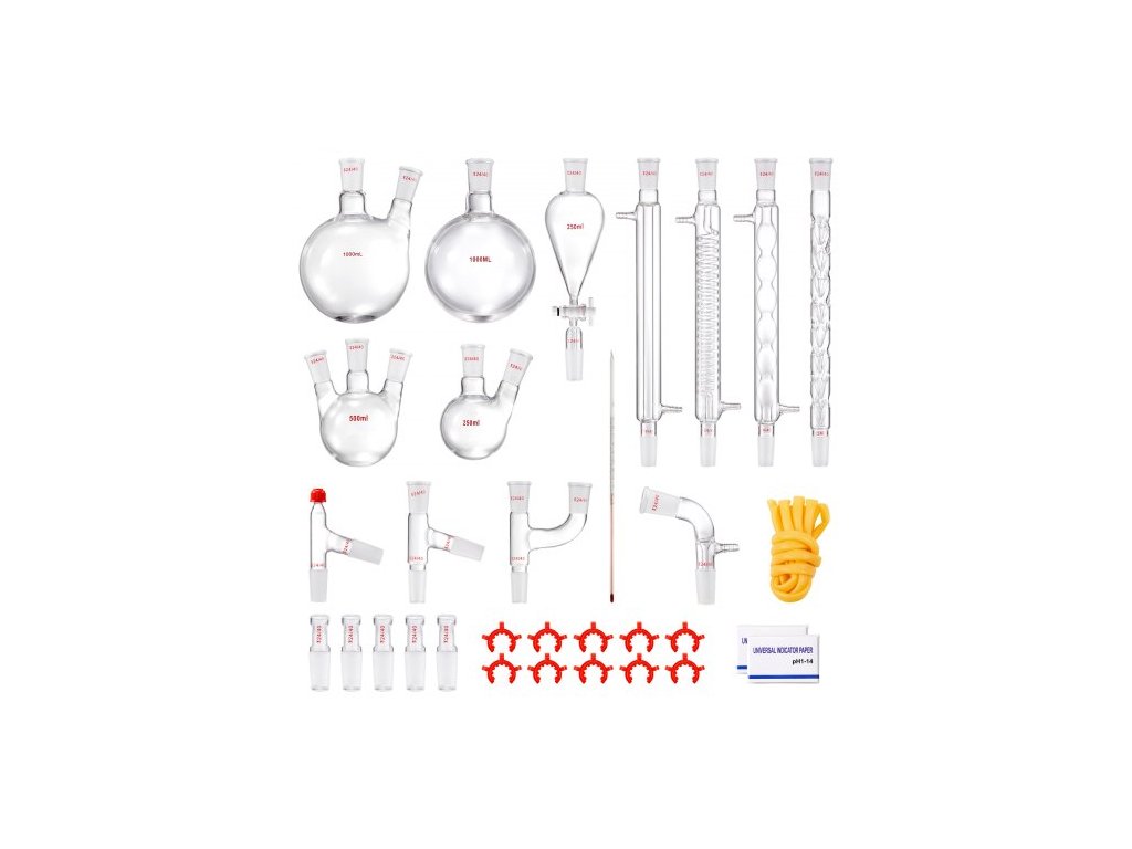 Laboratorní destilační sada , sada 3,3 Boro Lab Glassware Destilation Kit s 24 a 40 spoji, sada aparatury pro destilaci esenciálních olejů o objemu 1000 ml, sada 32 kusů skleněného vybaveníBezpečnost a odolnost