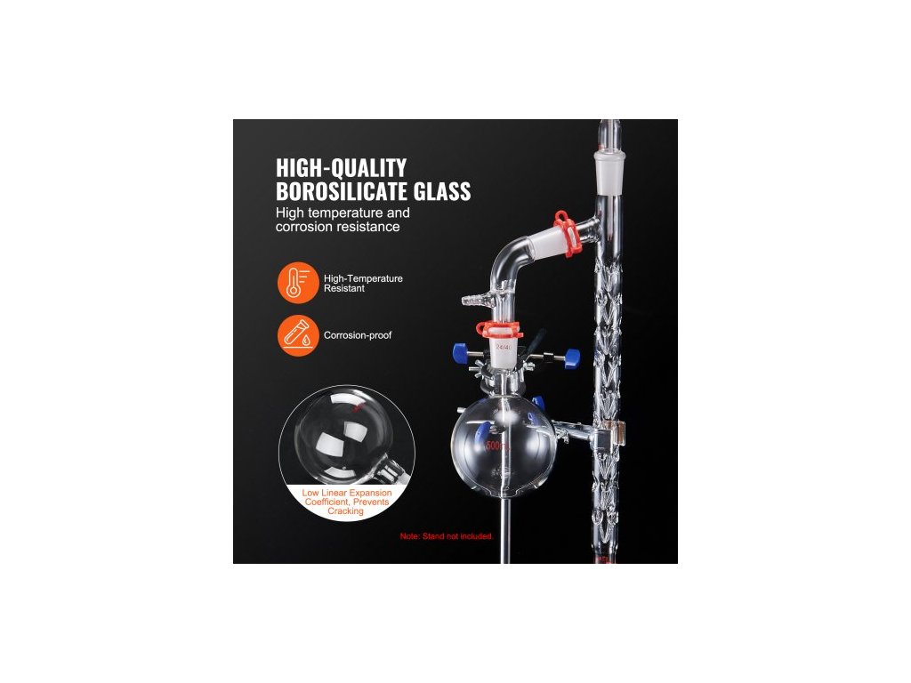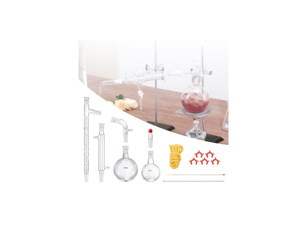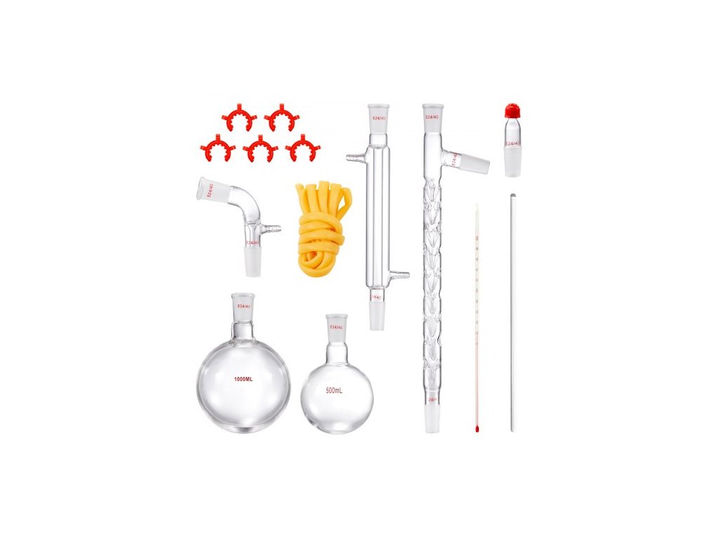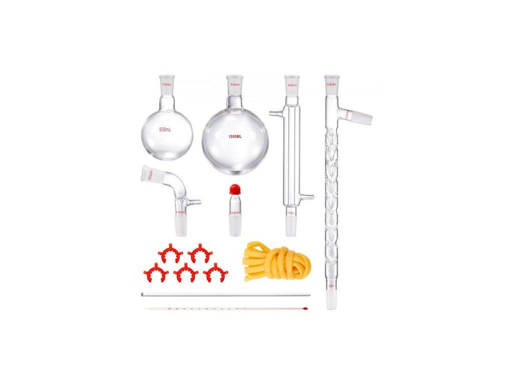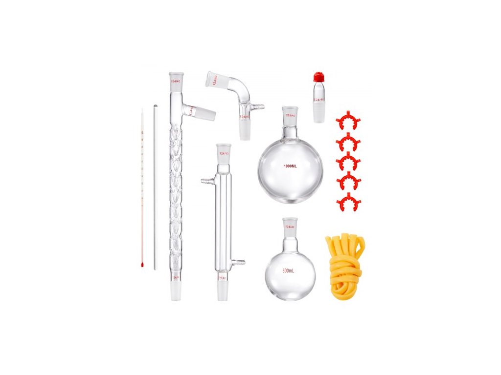 Laboratorní destilační sada , sada 3.3 Boro Lab Glassware Destilation Kit s 24 a 40 spoji, sada aparatury pro destilaci esenciálních olejů o objemu 1000 ml, sada 14dílného skleněného vybaveníBezpečnost a odolnost