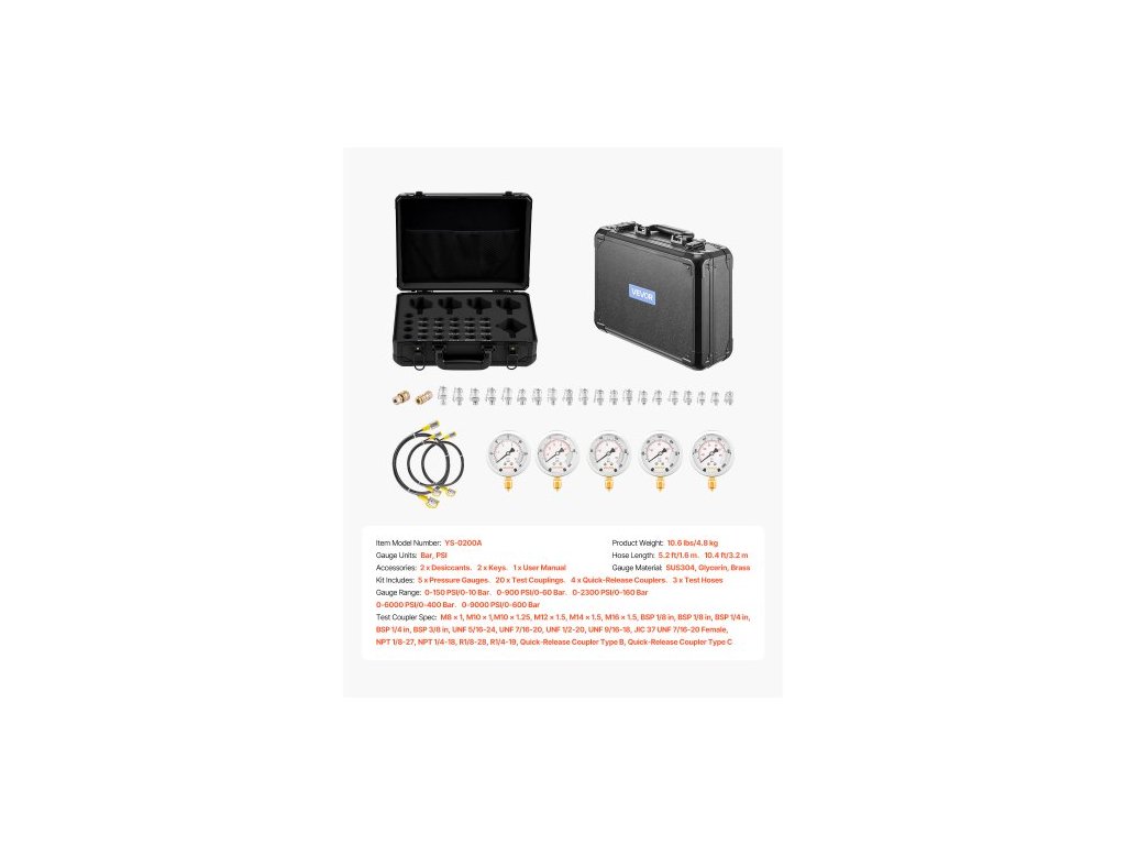 Sada pro hydraulickou tlakovou zkoušku , 10/60/160/400/600 barů (150/900/2300/6000/9000 PSI), Sada hydraulických manometrů 5 manometrů 20 spojek 4 rychlospojky 3 hadice pro bagry a stavební strojePlastový uzávěr
