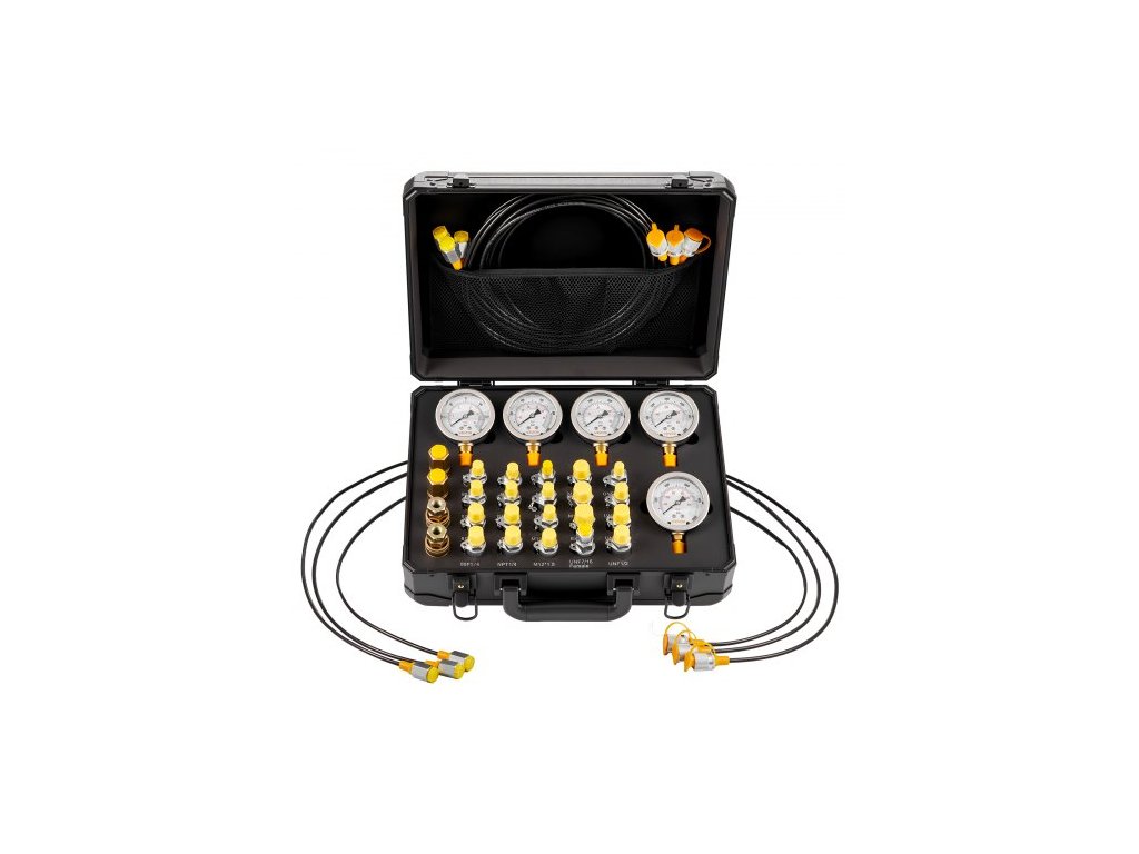 Sada pro hydraulickou tlakovou zkoušku , 10/60/160/400/600 barů (150/900/2300/6000/9000 PSI), sada hydraulických manometrů, 5 manometrů, 20 spojek, 4 rychlospojky, 3 hadice pro bagry a stavební stroje