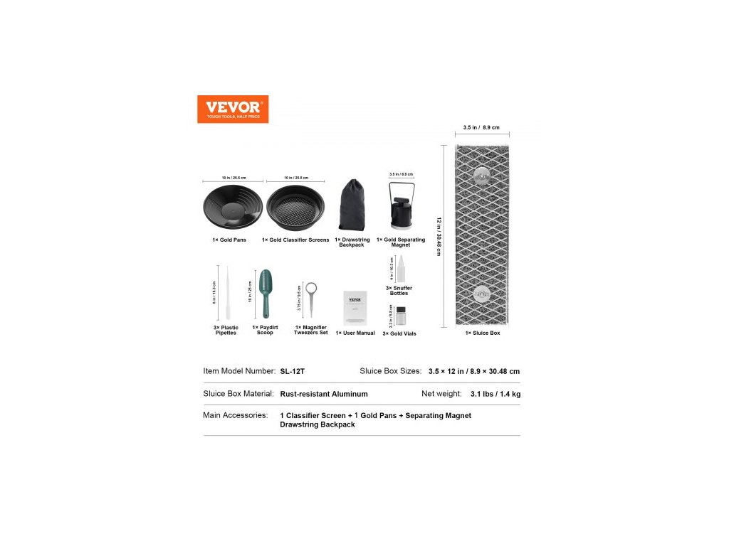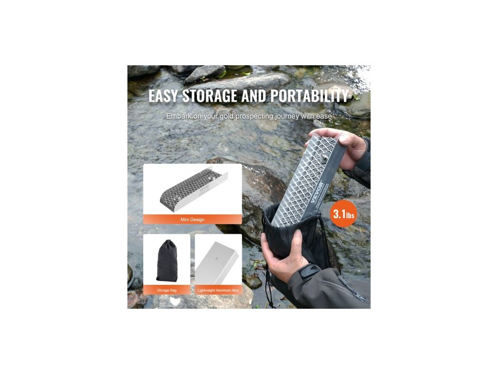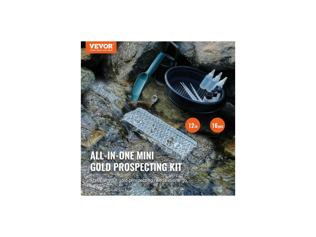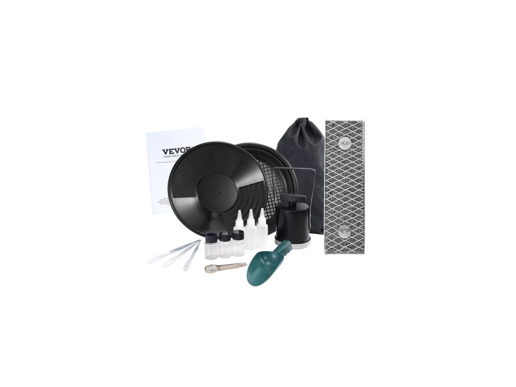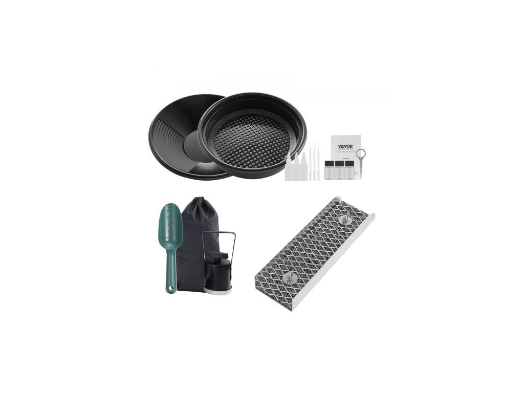 Sada pro rýžování zlata s mini stavidlem, 12" hliníkovým zařízením pro těžbu zlata, 16dílnou sadou pro hledání zlata se zlatou pánví, klasifikačním sítem, oddělovacím magnetem, batohem se stahovací šňůrkou a příslušenstvím