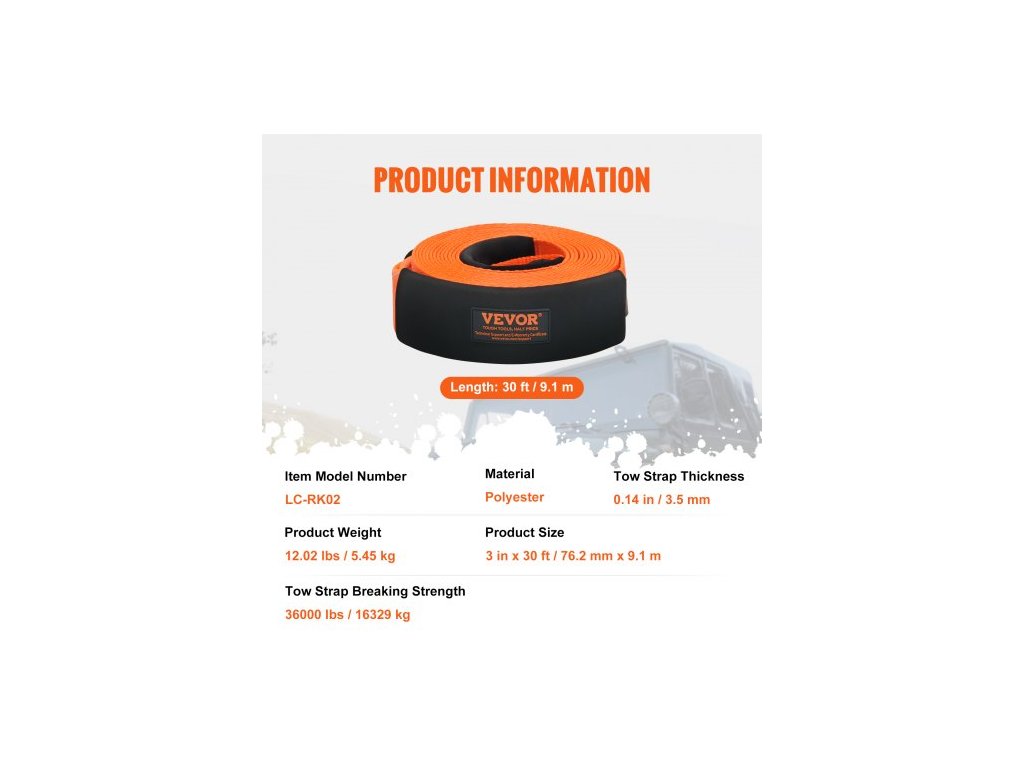 Tloušťka tažného popruhu: 0,14 palce/3,5 mm,Číslo modelu položky: LC-RK02,Hmotnost výrobku: 12,02 liber/5,45 kg,Materiál: Polyester,Pevnost tažného popruhu: 36 000 liber/16 329 kg,Rozměry výrobku: 3,35 palce x 30 stop/85,1 mm x 9,1 m
