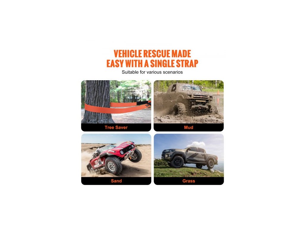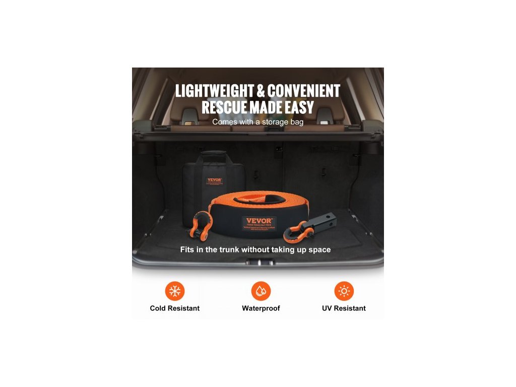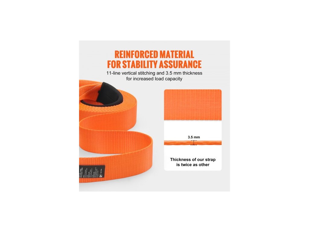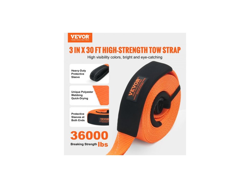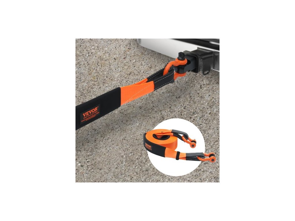 Sada pro vyprošťování tažného popruhu z polyesteru pro vysoké zatížení, 3" x 30 stop/7,6 cm x 9,1 m (MBS-36 000 liber/16 329 kg), navijákový popruh, trojitá zesílená smyčka, závěsný popruh + 2" (5,1 cm) závěsný držák + 3/4" (1,9 cm) D-kroužky (2 ks) + úložný vakVysoká pevnost
