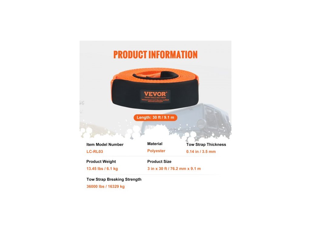 Tloušťka tažného popruhu: 0,14 palce/3,5 mm,Číslo modelu položky: LC-RL03,Hmotnost výrobku: 13,45 liber/6,1 kg,Materiál: Polyester,Pevnost tažného popruhu: 36 000 liber/16 329 kg,Rozměry výrobku: 3 palce x 30 stop/76,2 mm x 9,1 m