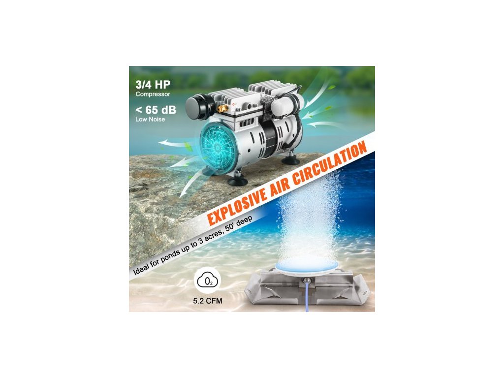 Sada provzdušňovače jezírka 3/4 HP s 2x 3048 cm trubicemi a 2x 20 cm difuzéryEfektivní přívod kyslíku