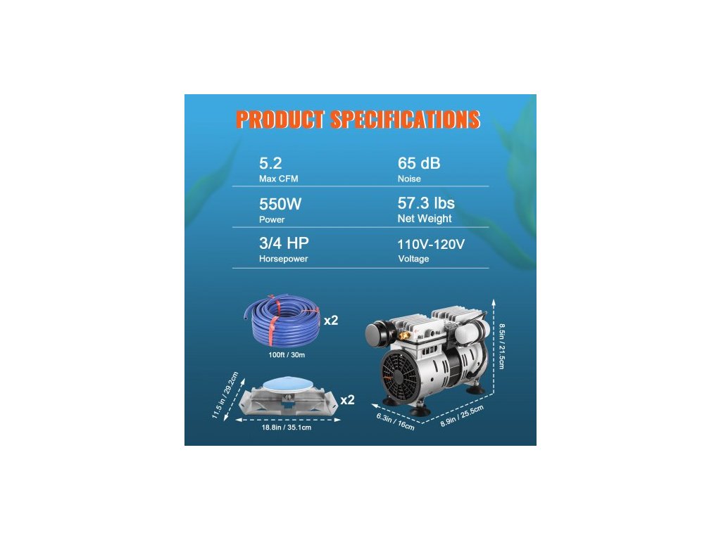Hladina hluku: 65 dB,Rozměry základny difuzéru: 18,8 x 11,5" / 35,1 x 29,2 cm,Rozměry difuzéru: 8"/20 cm,Napětí: 220 V,Model: OLF400D-140BS-C,Rozměry vzduchového kompresoru: 8,9 x 6,3 x 8,5 palce / 25,5 x 16 x 21,5 cm,Rozměry vzduchového potrubí: 100'x3/8"/30,5 m x 9,5 mm,Max. velikost jezírka: 3 akry,Výkon: 3/4 HP/550 W,Max. CFM: 5,2