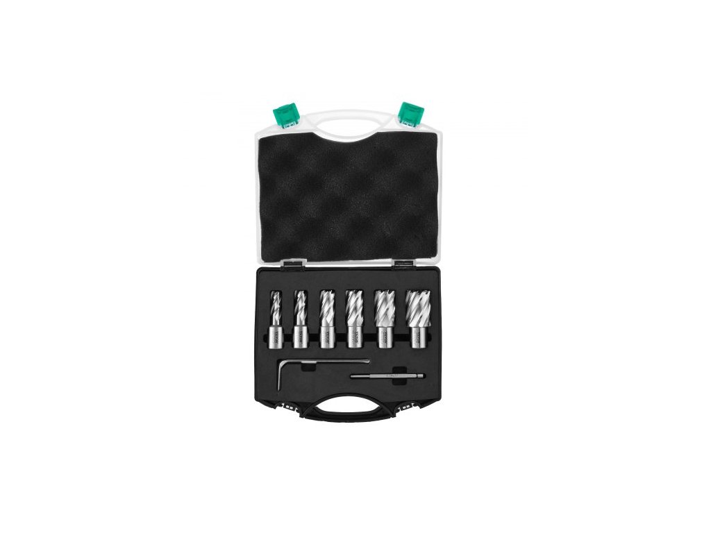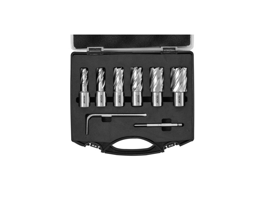 Sada prstencových fréz , 6 ks vrtáků s upínací stopkou Weldon Mag, hloubka řezu 2,5 cm, průměr řezu 1,27 až 1–2,7 cm, rychlořezná ocel M2AL, s vodicím kolíkem a přenosným pouzdrem, pro použití s magnetickými vrtačkamiRobustní a odolné