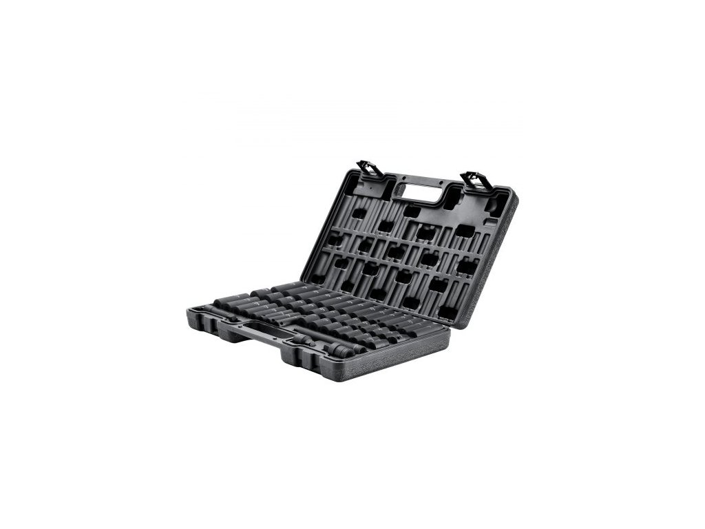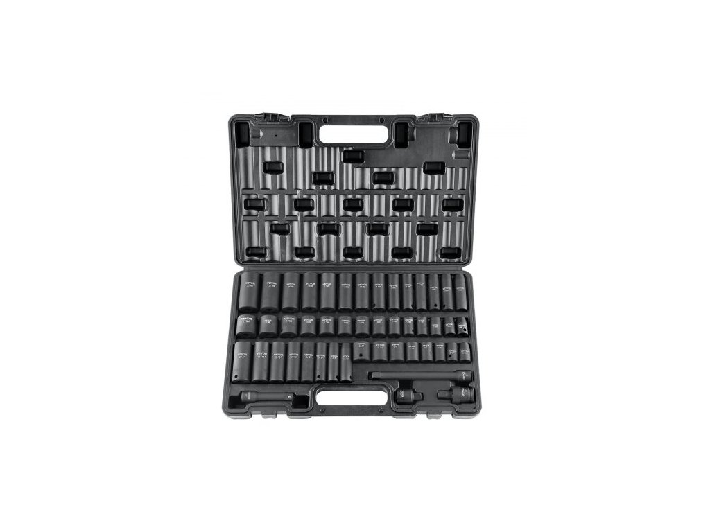 Sada rázových nástrčných klíčů 3/8", 48dílná sada nástrčných klíčů SAE (5/16" - 3/4") a metrické (8-22 mm) s 6hrannou prodlužovací tyčí Cr-V, univerzálním kloubem a adaptérem pro vrtačku. Včetně úložného pouzdra.Robustní a odolné