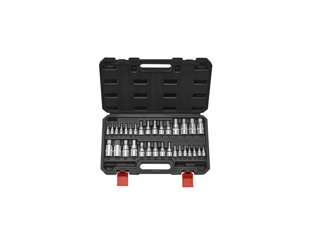 Sada šestihranných bitů , 32dílná, legovaná ocel S2 a chrom-vaděčová ocel, standardní SAE a metrické rozměry, pohony 1/4 palce, 3/8 palce a 1/2 palce, s vylepšeným úložným pouzdrem, sada imbusových hlavic pro mechaniky a opravy automobilůJedna sada pokrývá všechny potřeby