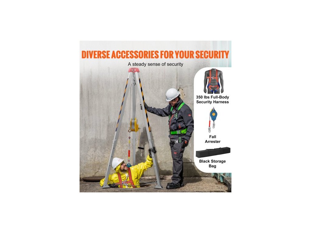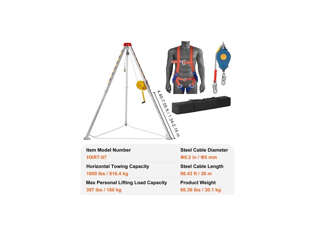 Horizontální tažná kapacita: 1800 lbs/816,4 kg, Nastavitelný rozsah délky nohou: 4,40-7,05 ft/1,34-2,15 m, Číslo modelu položky: HXRT-07, Hmotnost výrobku: 66,36 lbs/30,1 kg, Délka ocelového lana: 98,43 ft/30 m, Průměr ocelového lana: Φ0,2 palce/Φ5 mm, maximální nosnost pro osobní zvedání: 180 kg