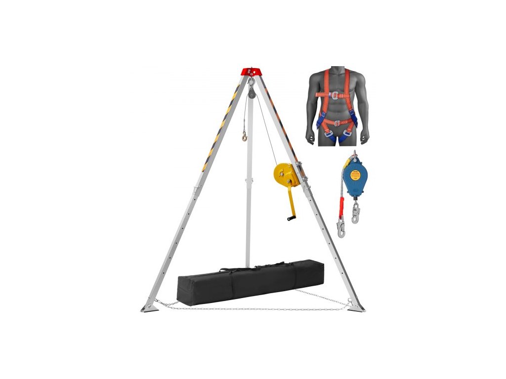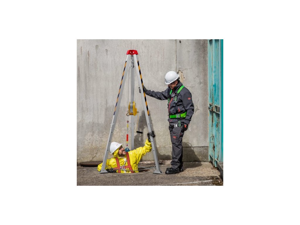Sada stativu pro uzavřené prostory, naviják 816,4 kg, stativ pro uzavřené prostory s nohami 2,13 m a lanem 30 m, záchranný stativ pro uzavřené prostory s ochranou proti pádu 10 m, postroj, úložná taška pro tradiční uzavřené prostoryNepřekonatelná tažná síla