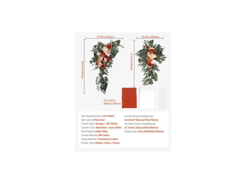 Materiál závěsů: Průsvitná látka,Materiál květin: Hedvábná látka,Rozměry závěsů: 21 x 2,5 stopy / 6400 x 760 mm,Barva závěsu: Cihlová červená + slonovinová bílá,Číslo modelu položky: XH-HQ04,Typ květiny: Jiřina + Růže + Pivoňka,Typ sady: Sada 4 kusů,Barva květiny: Oranžová + světle bílá,Velikost rohového květu (přírodní): 29,53 x 27,95 palce / 750 x 710 mm,Květina s uvázáním Velikost (přírodní): 705 x 390 mm, Čistá hmotnost: 1,18 kg, Velikost rohového květu (narovnaný): 1050 x 405 mm