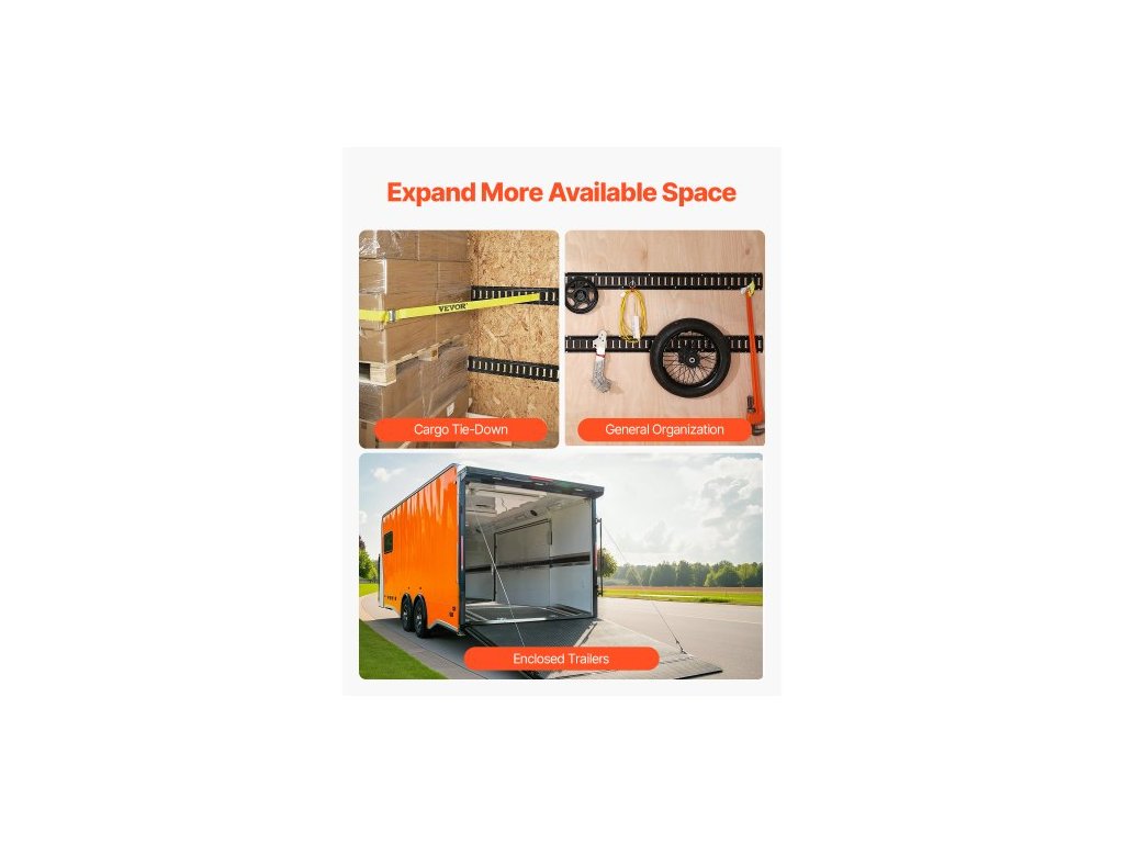 Sada upevňovacích lišt E Track, 18dílná sada 5' E-Tracks obsahuje 4 ocelové kolejnice, 8 kotev s O-kroužky, 4 upevňovací prvky s D-kroužky a 2 ráčnové popruhy, upevňovací příslušenství pro nákladní motocykly a jízdní kola, 2000 lbsOdolná opora