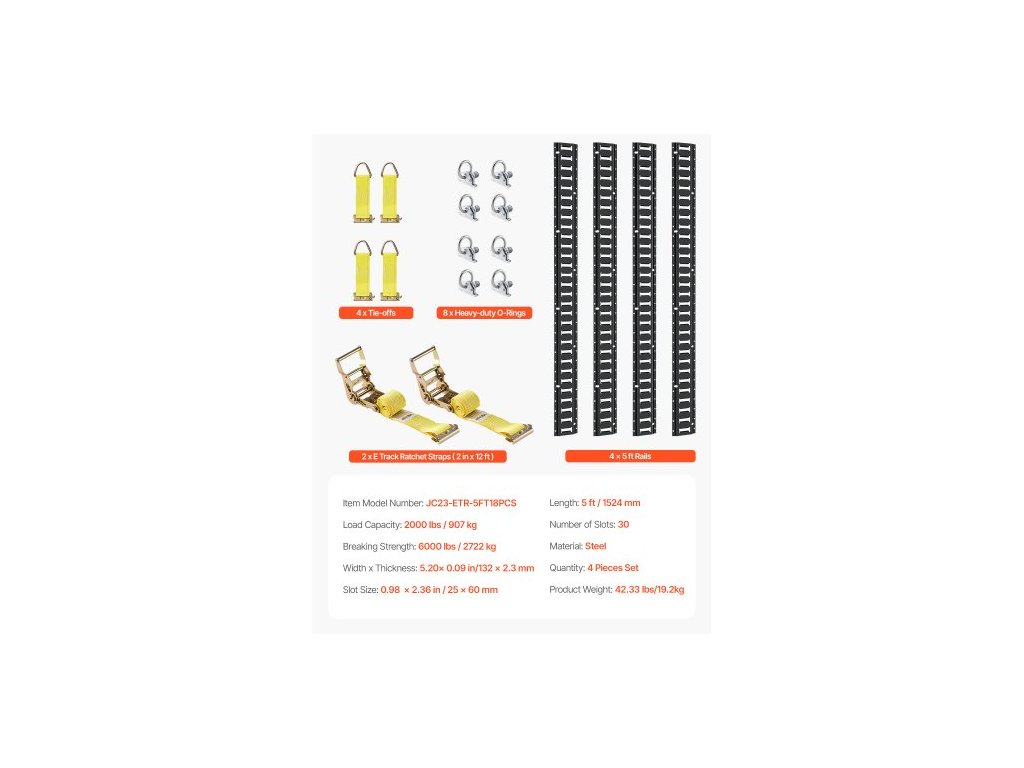 Sada upevňovacích lišt E Track, 18dílná sada 5' E-Tracks obsahuje 4 ocelové ližiny, 8 kotev s O-kroužky, 4 upevňovací prvky s D-kroužky a 2 ráčnové popruhy, upevňovací příslušenství pro nákladní motocykly a kola, 2000 lbs