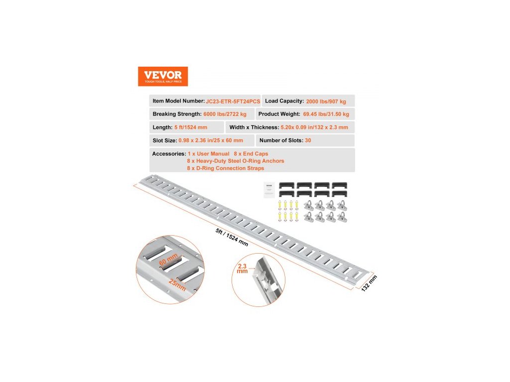 Nosnost: 2000 liber/907 kg,Délka: 5 stop/1524 mm,Mez pevnosti v tahu: 6000 liber/2722 kg,Číslo modelu položky: JC23-ETR-5FT24PCS,Hmotnost výrobku: 69,45 liber/31,50 kg,Šířka x tloušťka: 5,20 x 0,09 palce/132 x 2,3 mm, Materiál: Ocel 45#, Velikost drážky: 0,98 x 2,36 palce/25 x 60 mm, Počet drážek: 30