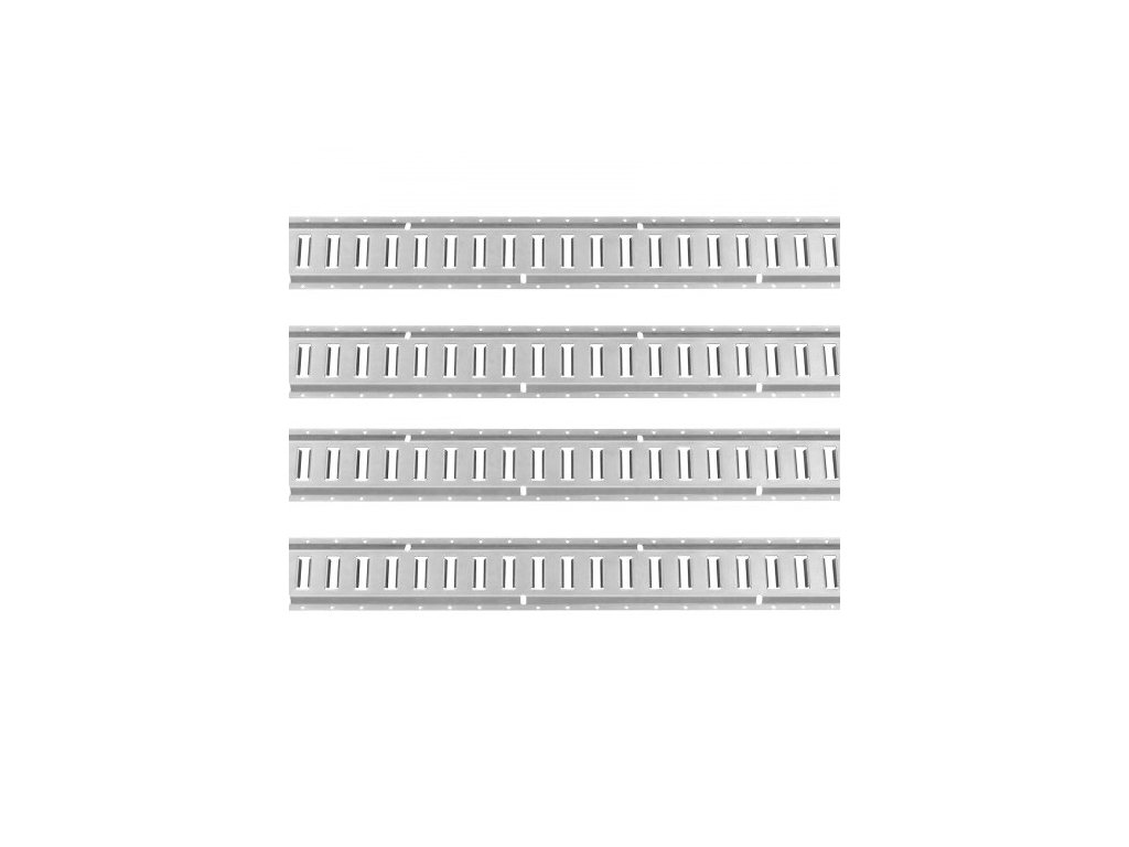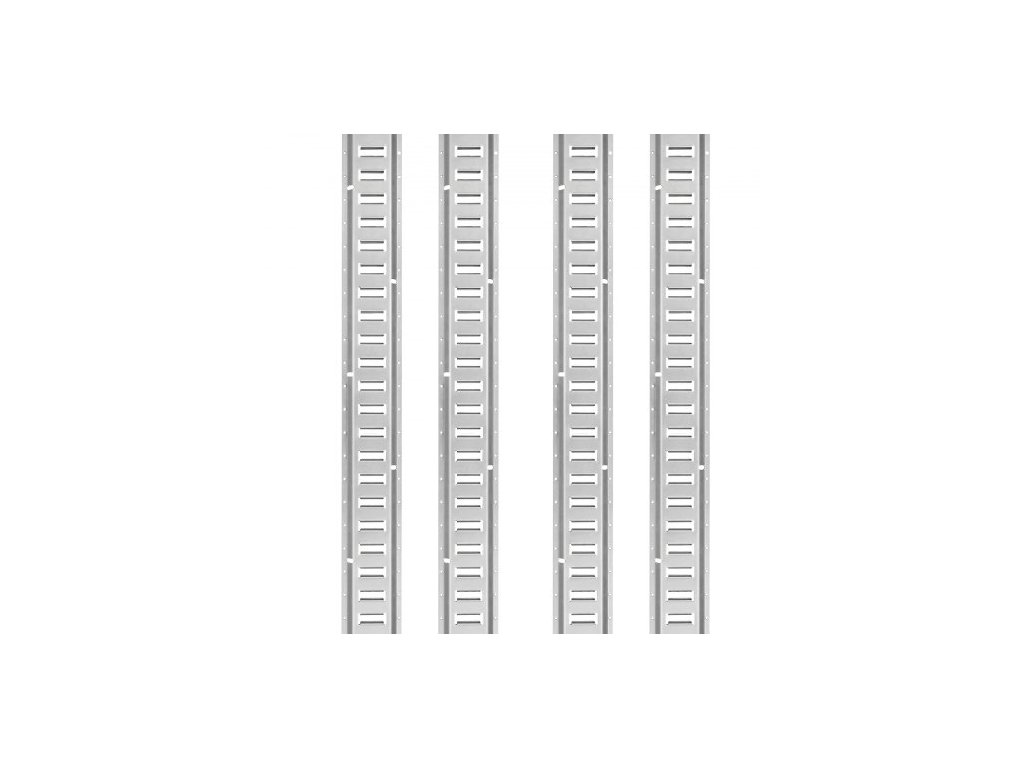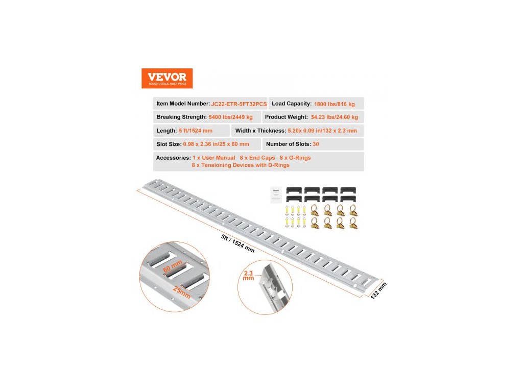 Rozměry úchytů: 2 x 6 palců / 5 x 15 cm,Rozteč drážek: 1 palec / 25 mm,Průměr O-kroužku: 2,5 palce / 64 mm,Barva: Stříbrná,Materiál: Ocel,Délka lišt: 5 stop / 1,52 m,Maximální nosnost úchytů: 1000 liber / 454 kg,Model: VV-ETS-TD534S,Délka drážky: 64 mm, tloušťka kolejnice: 2 mm, počet kusů: 34, hmotnost netto: 26 kg, šířka drážky: 25 mm, maximální nosnost O-kroužku: 680 kg, šířka kolejnice: 132 mm