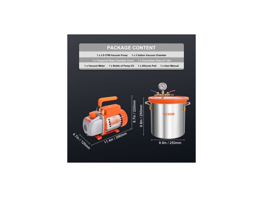 Sada vakuové komory 11,4 l a čerpadla 3,5 CFM, víko z tvrzeného skla, sada vakuové odplyňovací komory, jednostupňové vakuové čerpadlo s lahví na olej o objemu 250 ml, pro stabilizaci dřeva, odplyňování silikonů a epoxidůvíko z tvrzeného skla