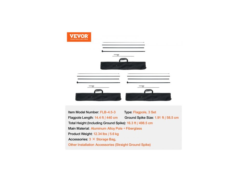 Typ: Stožár, 3 sady,Délka stožáru: 14,4 ft/440 cm,Velikost hrotu do země: 1,91 ft/58,5 cm,Číslo modelu položky: FLB-4.5-3,Hmotnost výrobku: 12,34 lbs/5,6 kg,Celková výška (včetně hrotu do země): 16,3 ft/498,5 cm,Hlavní materiál: Hliníková slitina stožáru + sklolaminát
