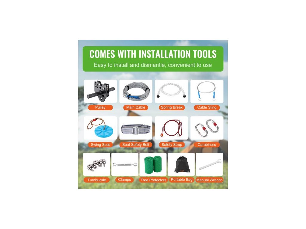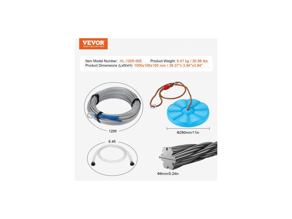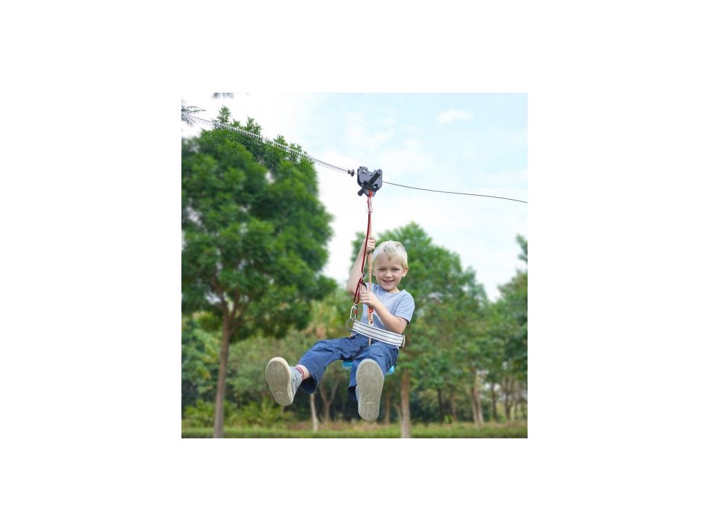Sada Zipline pro děti i dospělé, 36,6 m Zipline sady až do 226,8 kg, Rychlá instalace venkovní zipline na zahradu, Zábava na hřišti s nerezovou zipline, pružinová brzda, bezpečnostní pás, sedadloPro cvičení a hraní dětí