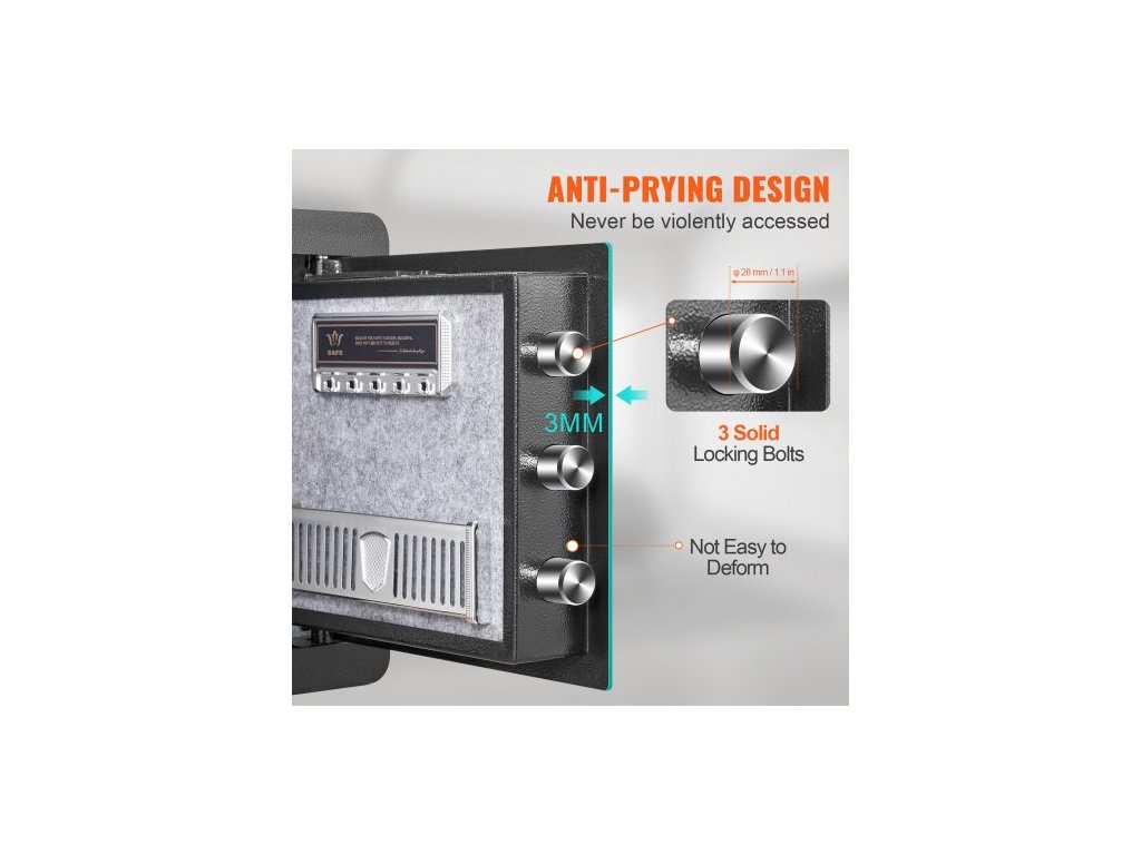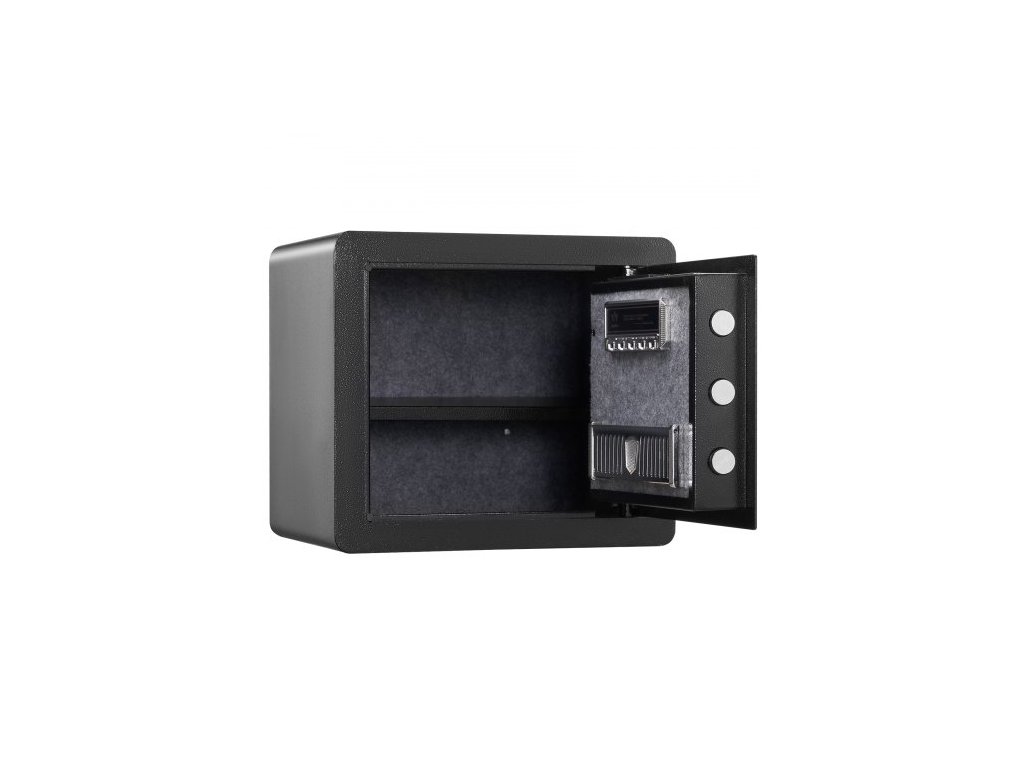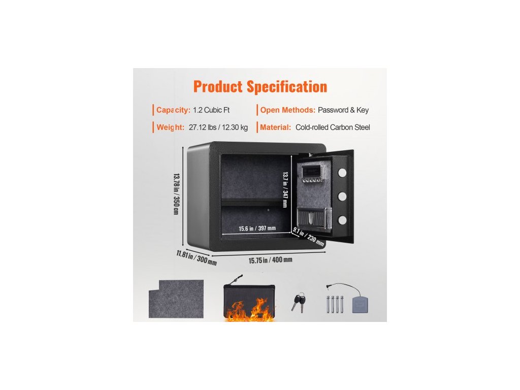 Počet zamykacích šroubů: 2,Objem: 1,2 krychlových stop,Způsoby otevírání: Heslo a klíč,Hmotnost trezoru: 27,12 liber/12,30 kg,Rozměry police: 15,35 x 11,42 palce/390 x 290 mm,Materiál: Uhlíková ocel válcovaná za studena,Vnější rozměry: 15,75 x 11,81 x 13,78 400x300x350 mm, tloušťka dveří: 3 mm, průměr zajišťovacích šroubů: 28 mm, vnitřní rozměry: 397x230x347 mm