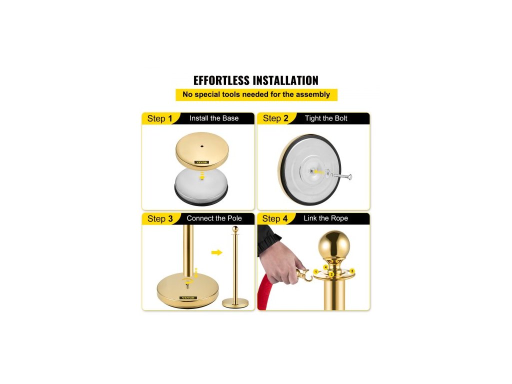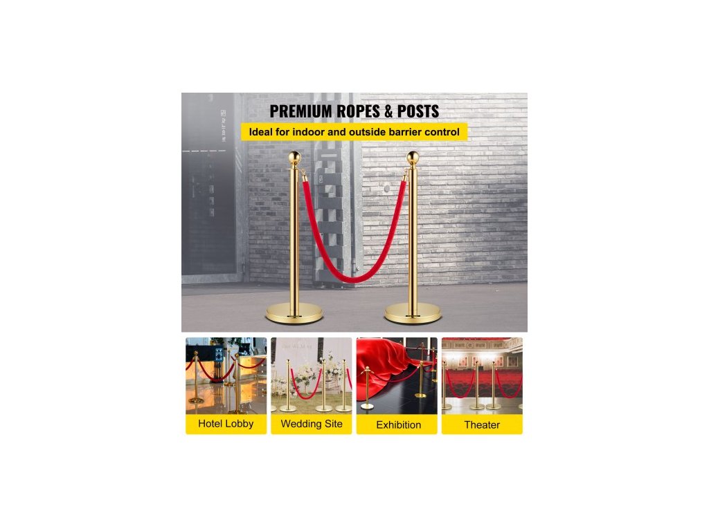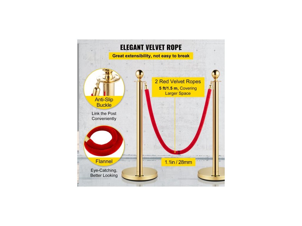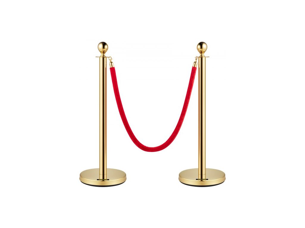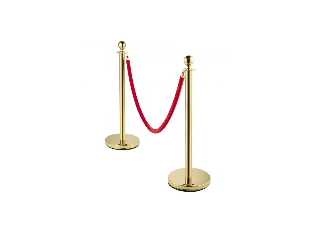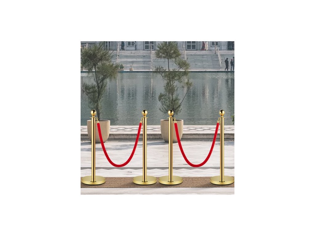 Celková výška: 96 cm, tloušťka stěny tyče: 0,8 mm, průměr základny: 32 cm, materiál lana: flanel, model: 4 ks zlatých sloupků, materiál sloupu: nerezová ocel, tloušťka lana: 28 mm, čistá hmotnost: 24 kg, barva lana: červená, průměr trubky: 5,1 cm, délka lana: 1,5 m