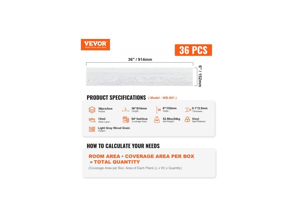 Vzor: světle šedá dřevěná kresba,Délka: 36''/914 mm,Model: WB-801,Výška: 0,1''/2,5 mm,Plocha krytí: 54² stop/krabice,Šířka: 6''/152 mm,Čistá hmotnost: 52,9 lbs/24 kg,Tloušťka nášlapné vrstvy: 0,3 mm/12 mil,Hlavní materiál: Vinyl,Kusů: 36 ks/krabice