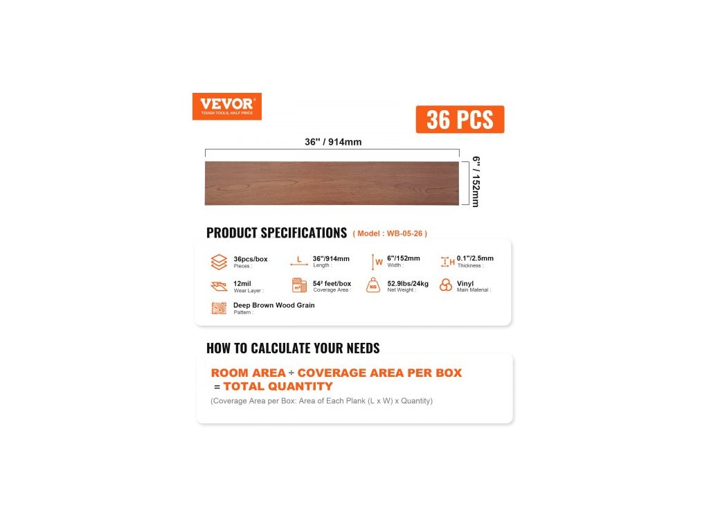 Vzor: tmavě hnědá dřevěná kresba,Délka: 36''/914 mm,Model: WB-05-26,Výška: 0,1''/2,5 mm,Plocha krytí: 54²stop/krabice,Šířka: 6''/152 mm,Čistá hmotnost: 52,9 lbs/24 kg,Tloušťka nášlapné vrstvy: 0,3 mm/12 mil,Hlavní materiál: Vinyl,Kusů: 36 ks/krabice