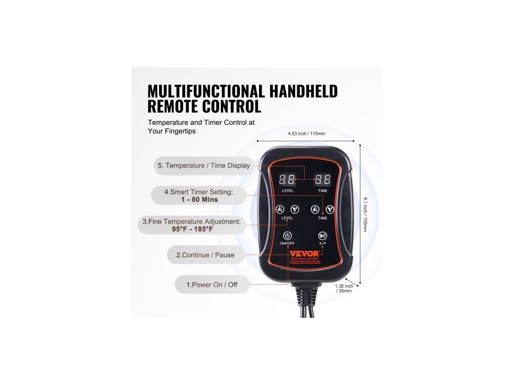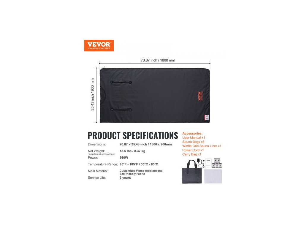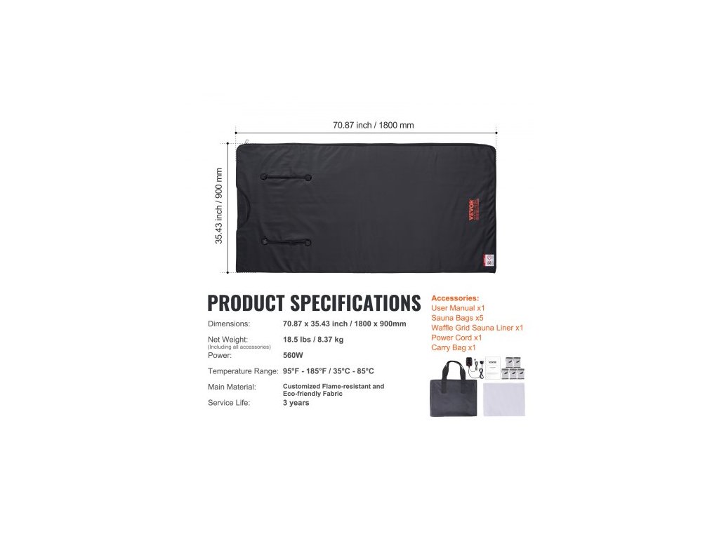 Životnost: 3 roky,Model: BW-801,Rozměry: 70,87 x 31,5 palce / 1800 x 800 mm,Teplotní rozsah: 1–6 úrovní (95 °F–185 °F / 35 °C–85 °C),Čistá hmotnost (včetně veškerého příslušenství): 18,5 lbs / 8,37 kg,Příkon: 560 W,Hlavní materiál: Na míru vyrobená nehořlavá a Ekologická tkanina